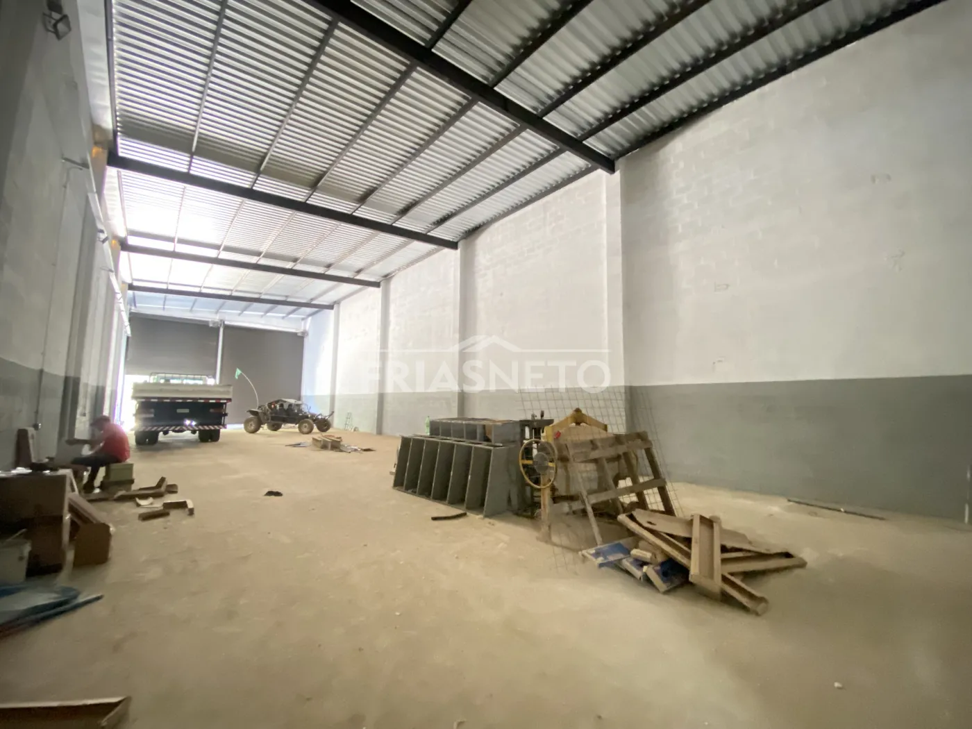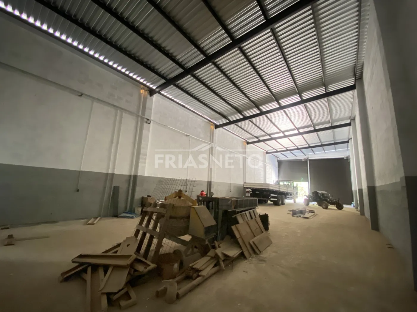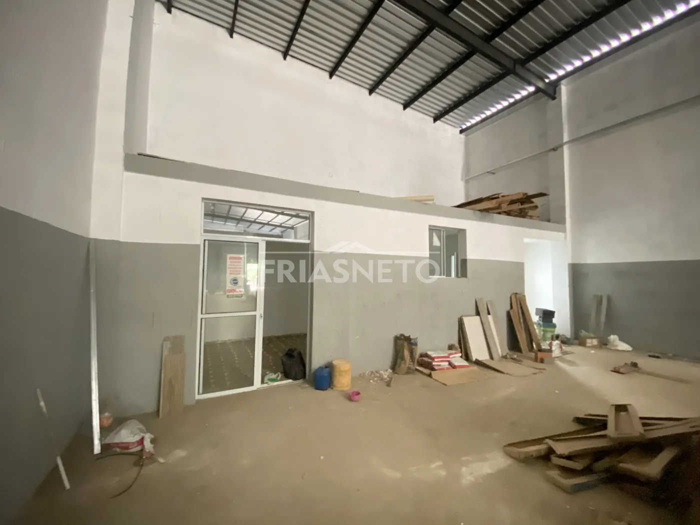Galpão comercial novo, medindo 316 M² com área livre de 300 M² e escritório com dois banheiros, pé direito de 6.40 M² com telhas de isolamento térmico, portas automáticas, piso de alto resistência, recuo para 04 vagas