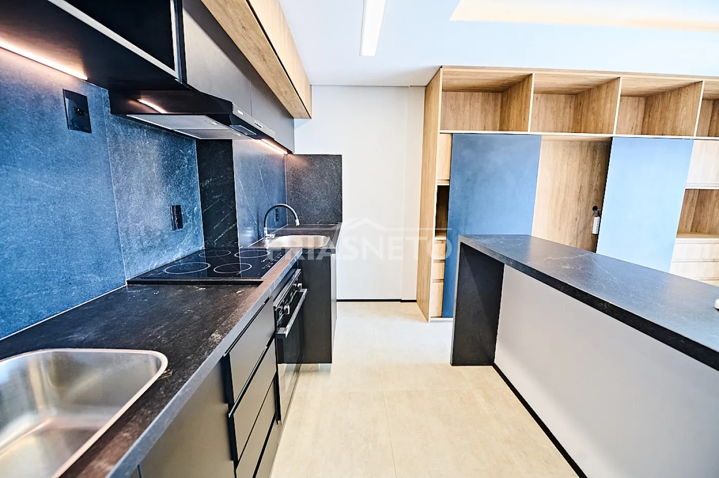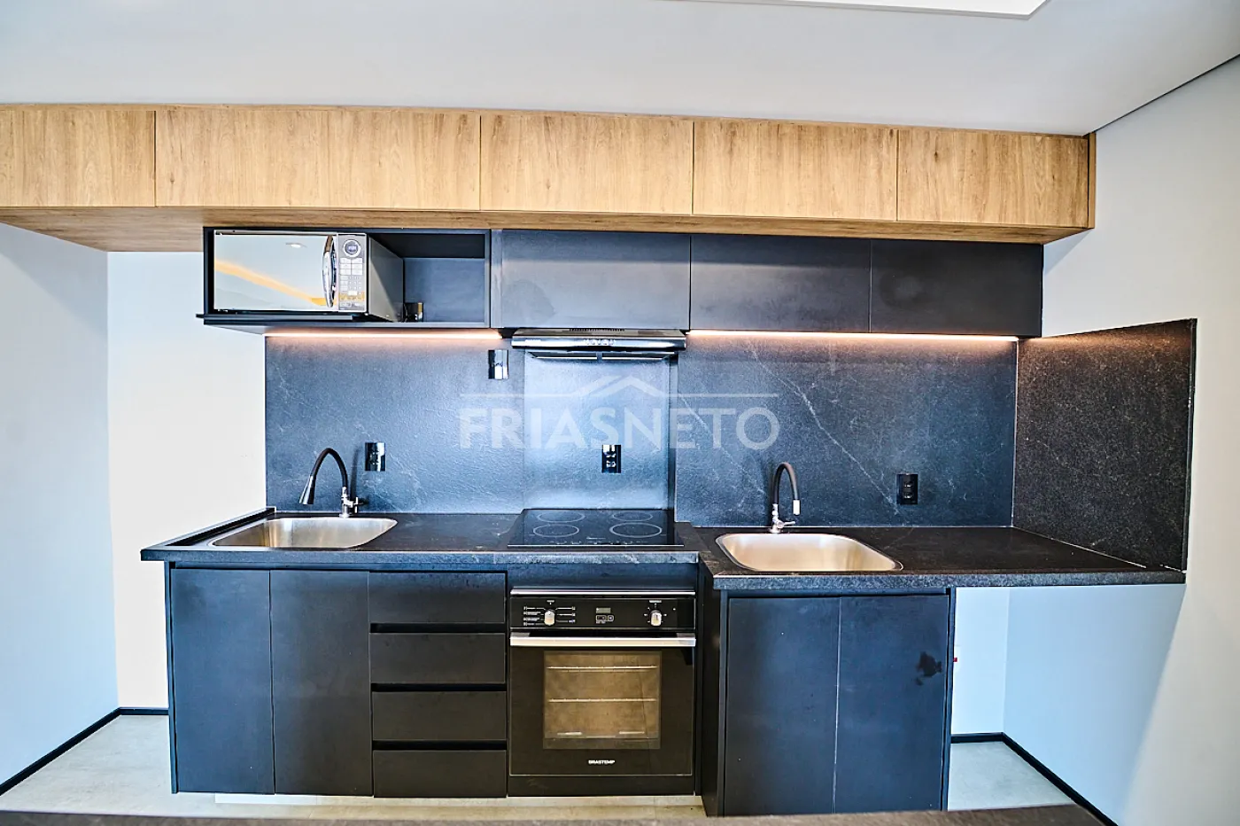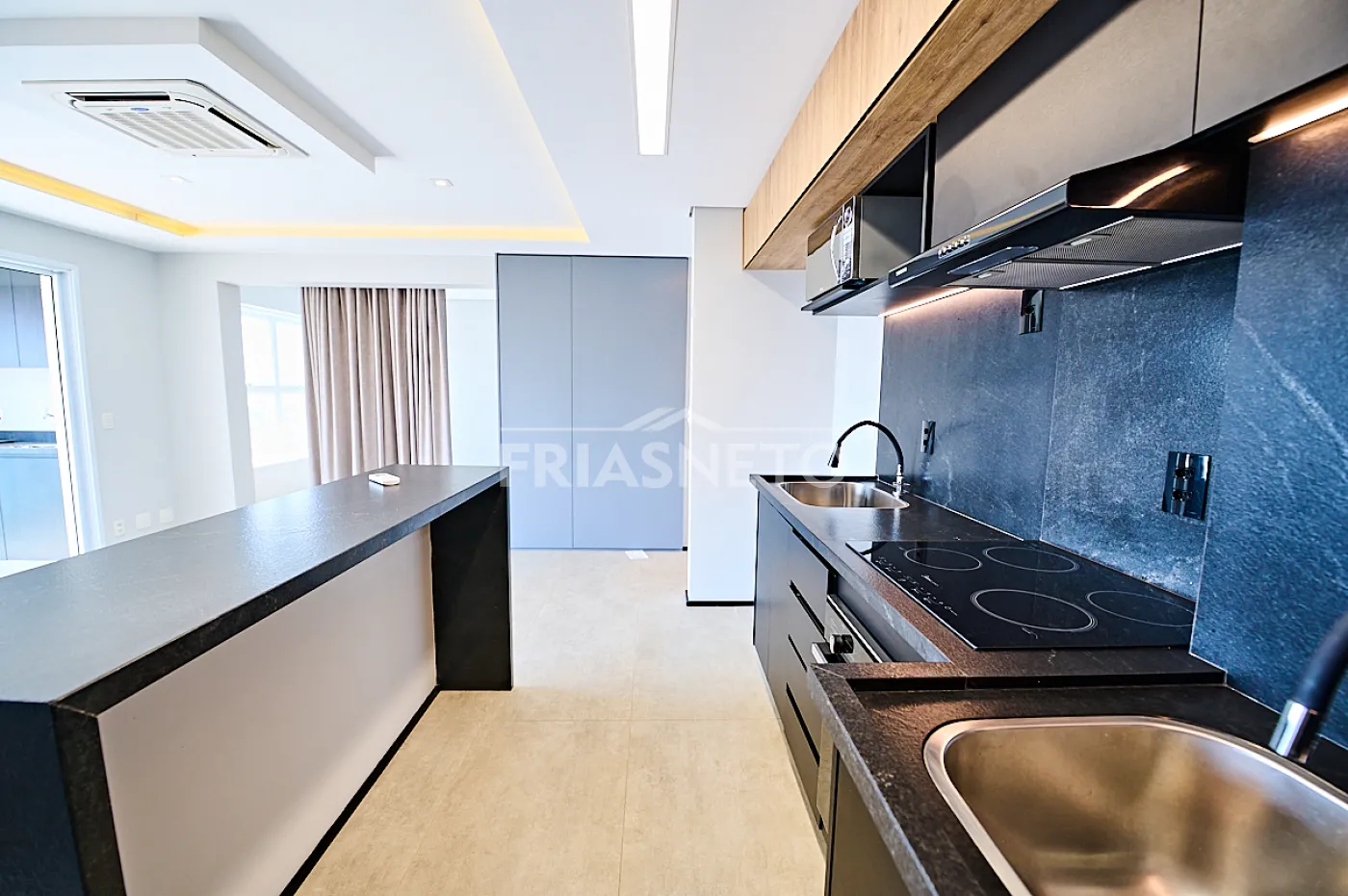 - Cozinha planejada com fogão, coifa e microondas.