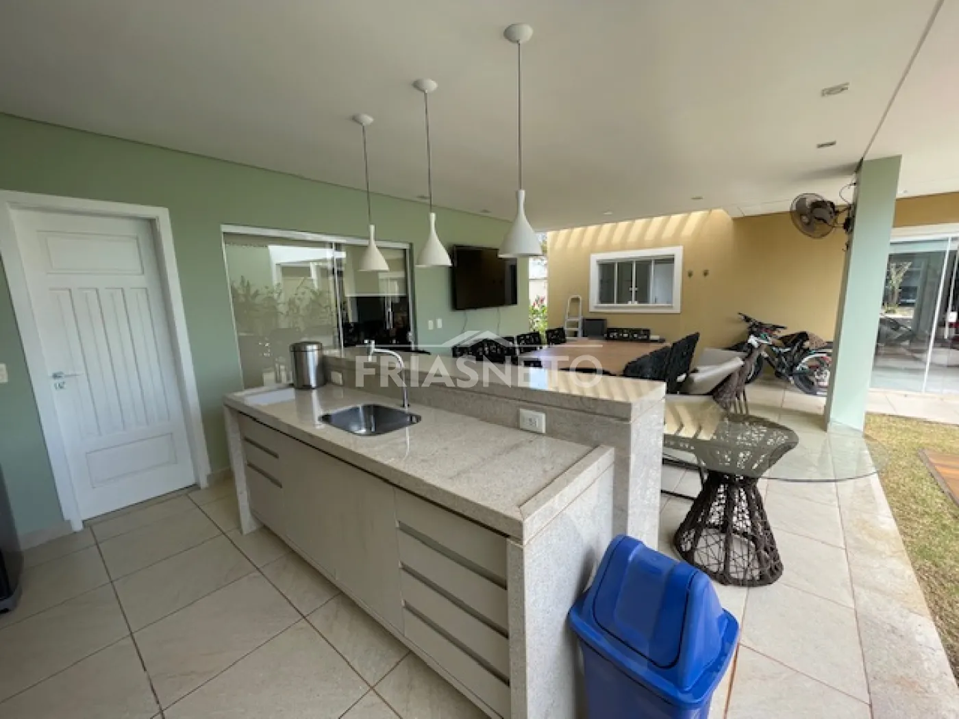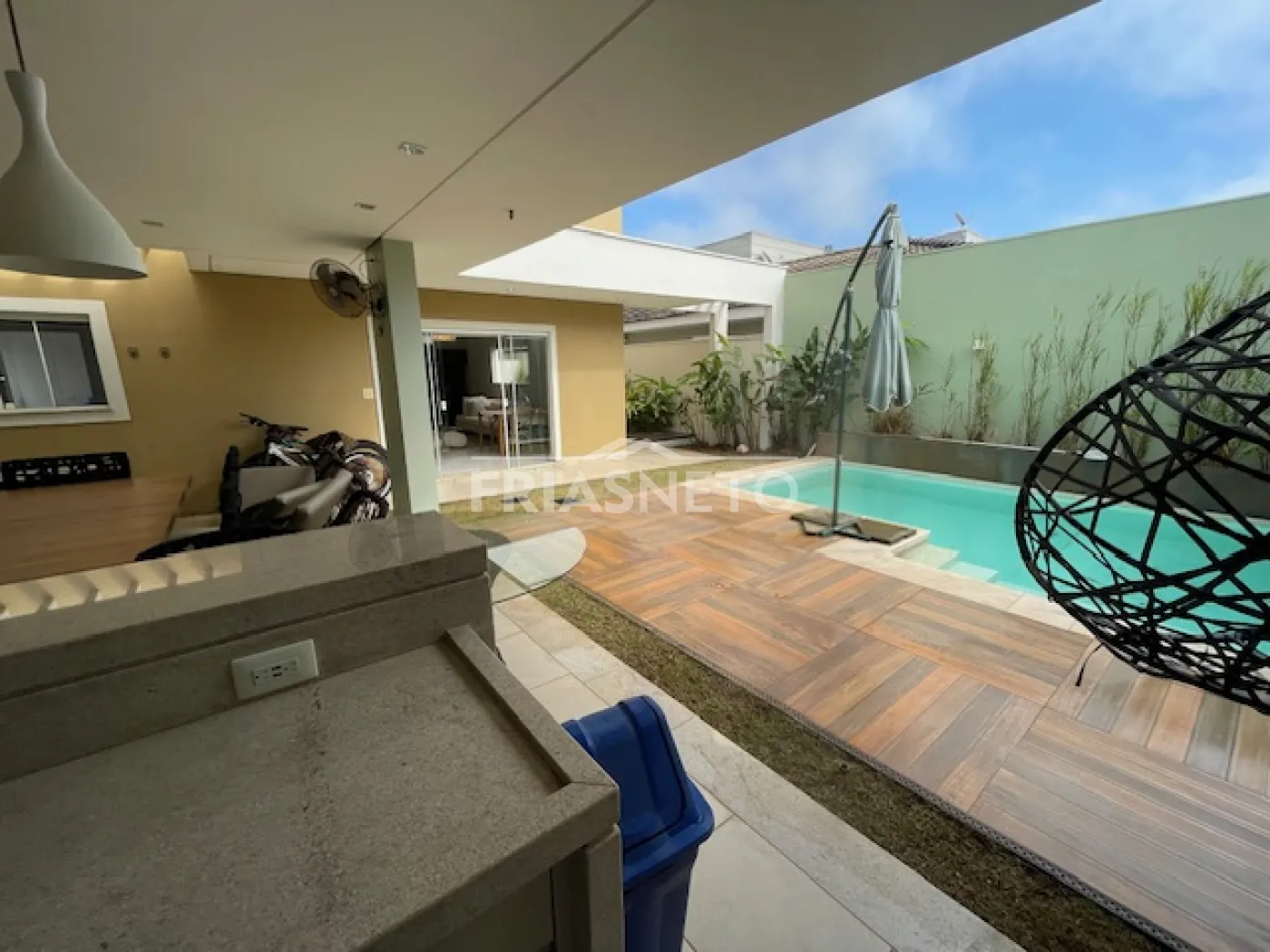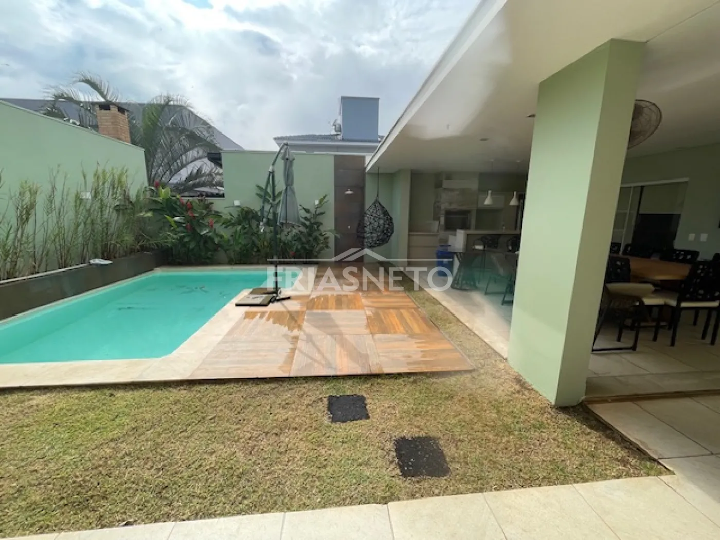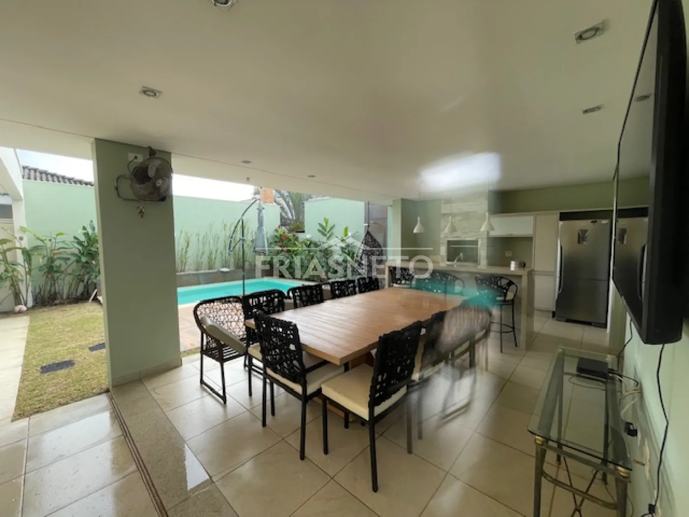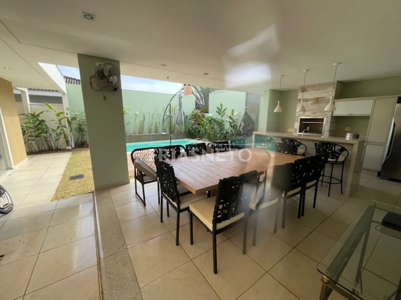 - espaço gourmet com armários planejados, piscina, churrasqueira, geladeira, TV, mesa para 10 lugares, 1 quarto, 1 despensa e 1 banheiro