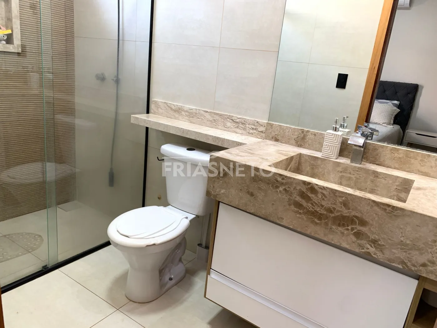 * banheiro suíte e social com armário planejado e box