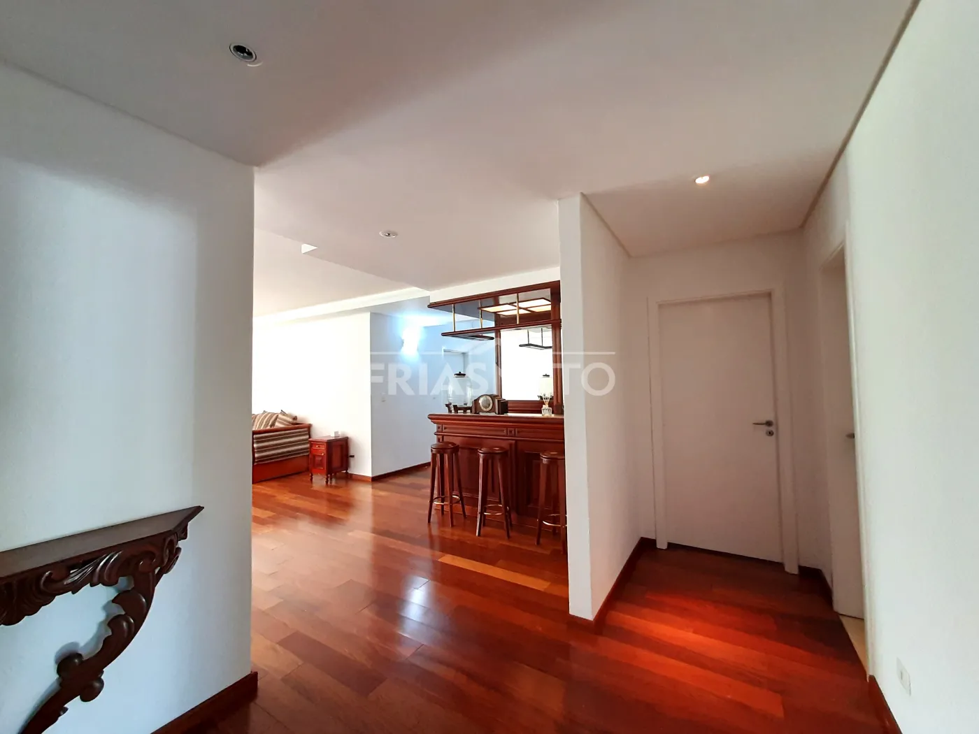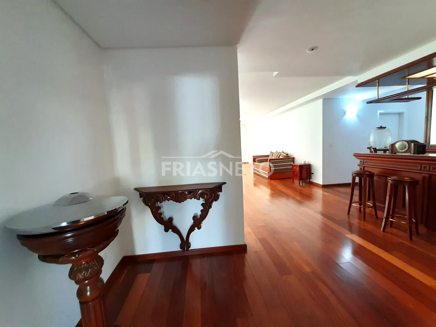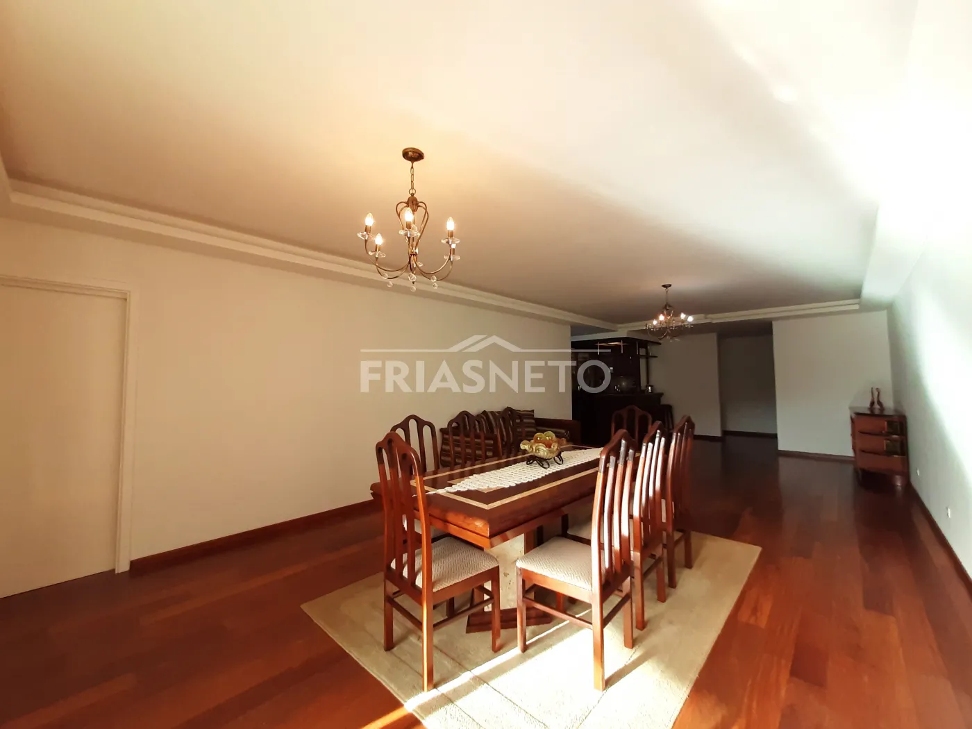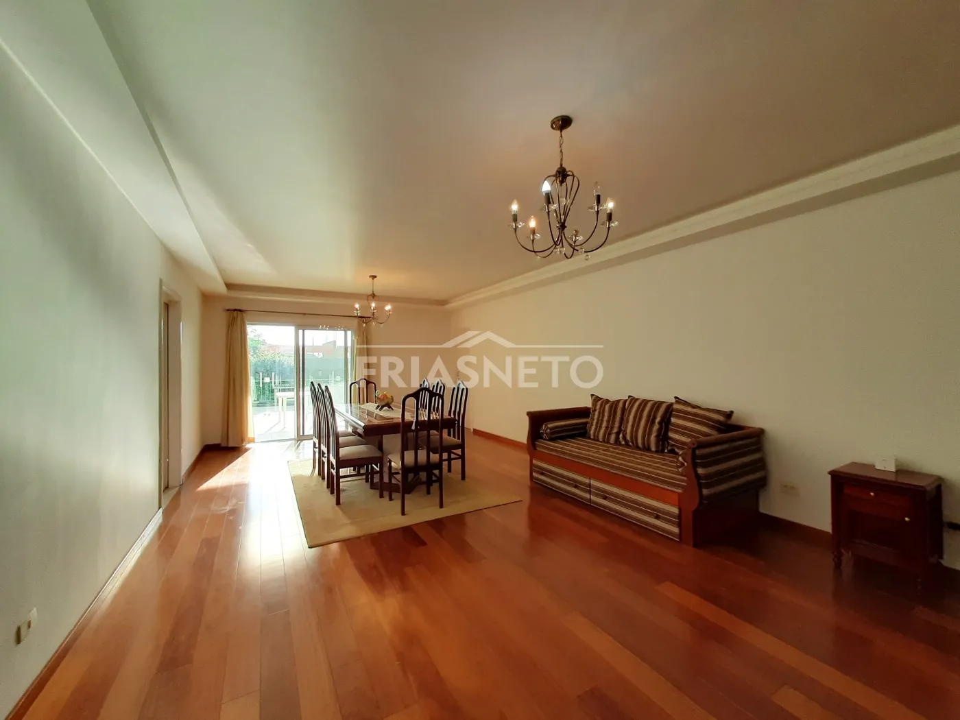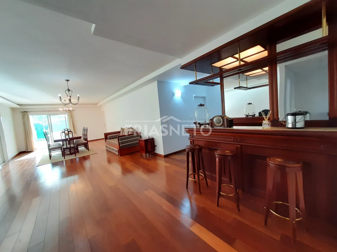 - Sala dois ambientes com iluminação em Led, com Bar em madeira, Sofá, Mesa de madeira com 8 lugares e Aparador de madeira, Cortinas;