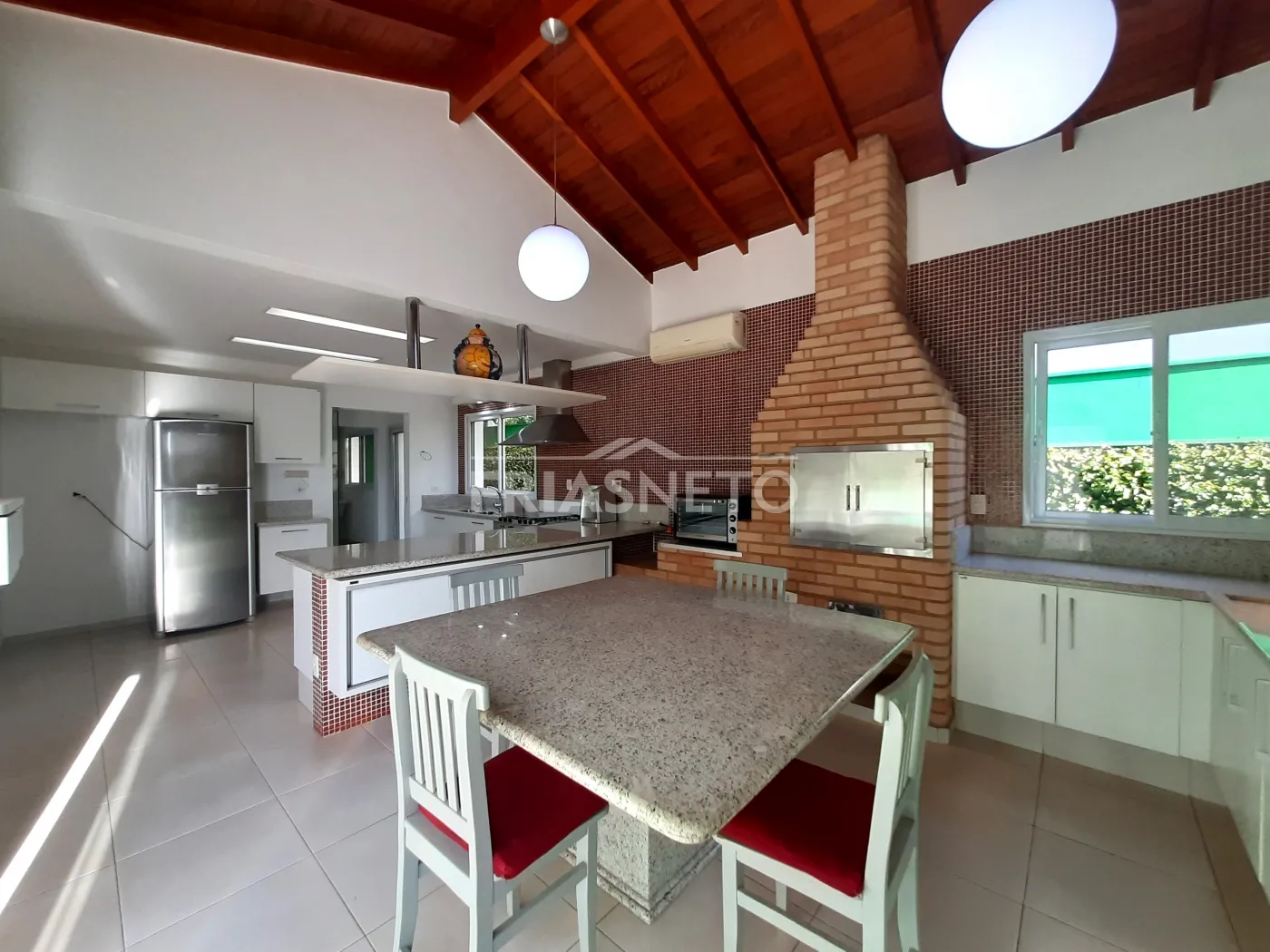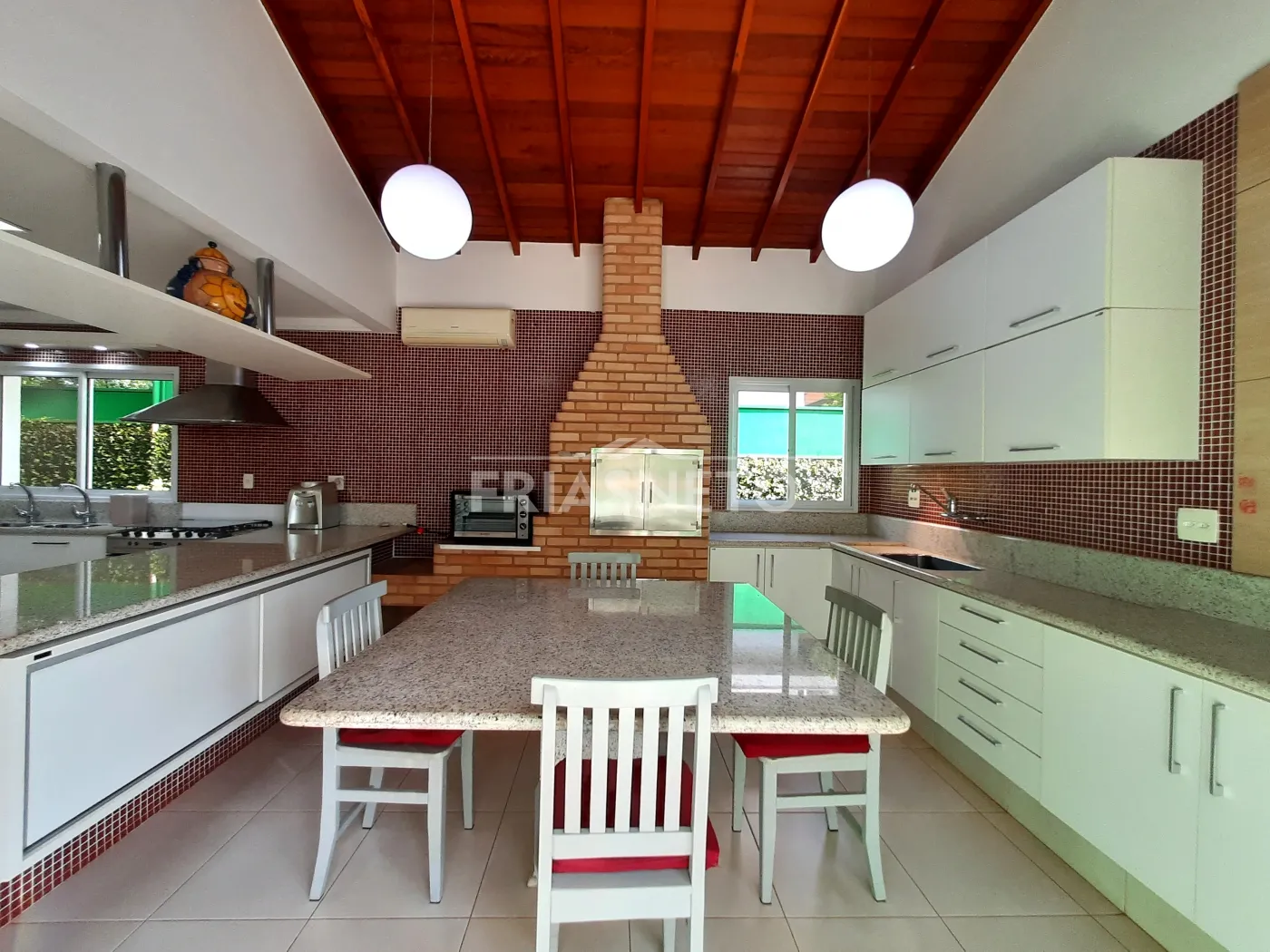 - Área gourmet integrada a cozinha, com armários embutidos, mesa de mármore embutida com cadeiras, Churrasqueira, com área externa integrada com fechamento em vidro temperado;