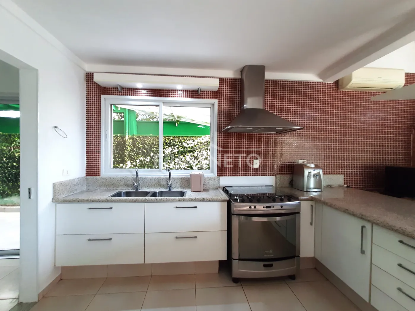 - Cozinha completa com armários embutidos, bancada em mármore, fogão e coifa em Inox;