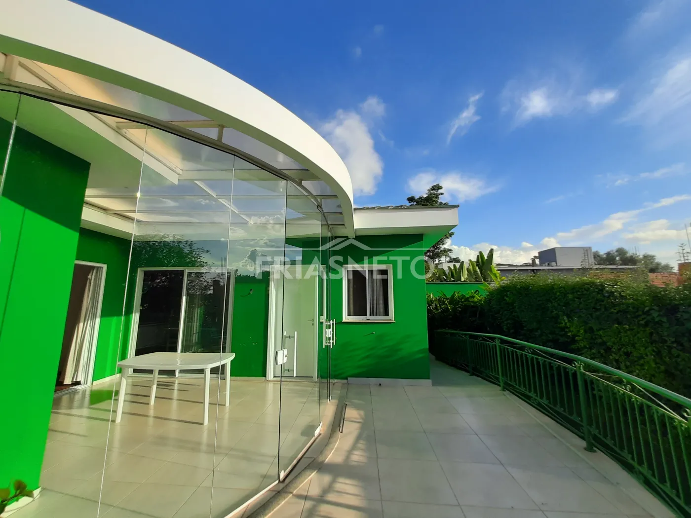 - Banheiro externo com pia com gabinete, espelho e Box em vidro temperado;