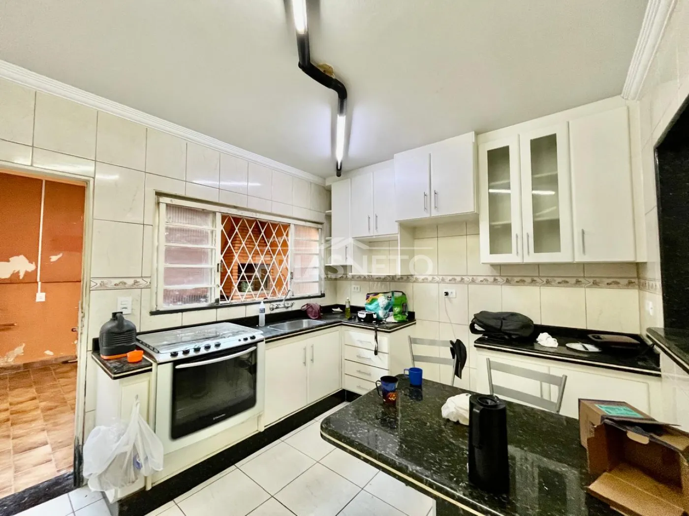 - Cozinha americana planejada com fogão e mesa embutida