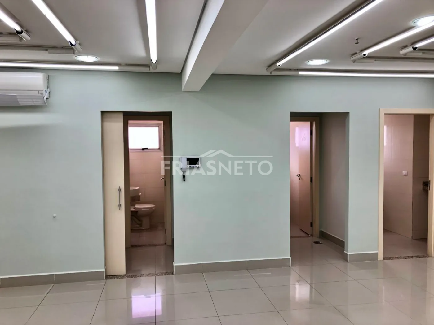 Sala para alugar no bairro Vila Monteiro em Piracicaba no condomínio JK Medical Center com 100m² de construção, 2 salas com banheiro e ar condicionado, salão principal com ar condicionado, 1 banheiro e 1 copa, 1 vaga de garagem.