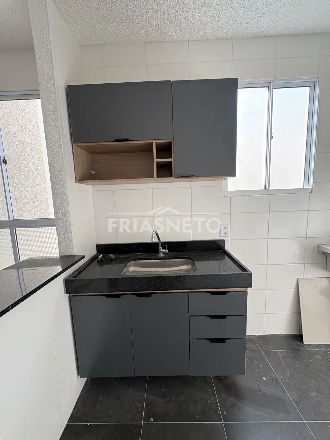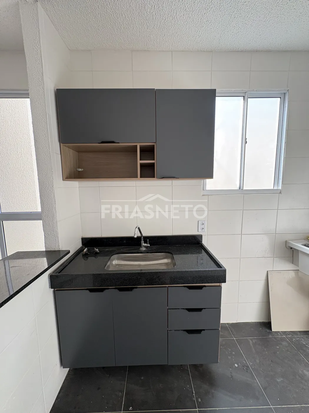 Cozinha com gabinete e armário suspenso.