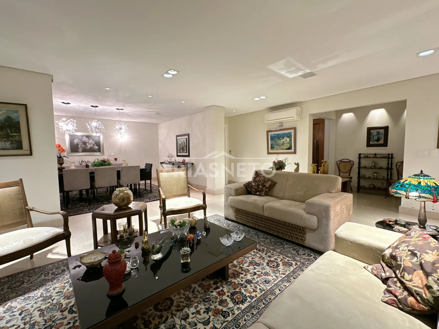 Amplo living integrado à sala de jantar;