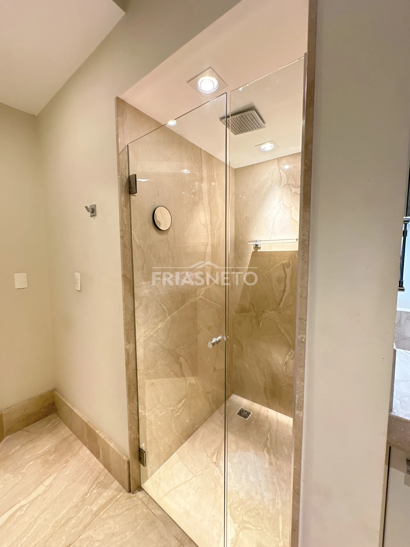 Banheiros revestidos em mármore Diano Reale.