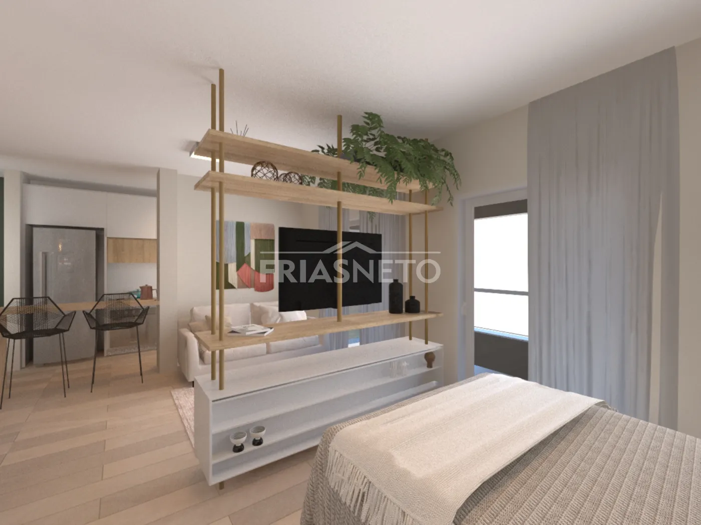 Apartamento de 44m² conta com: Sala com varanda gourmet, 1 dormitório e 1 vaga.