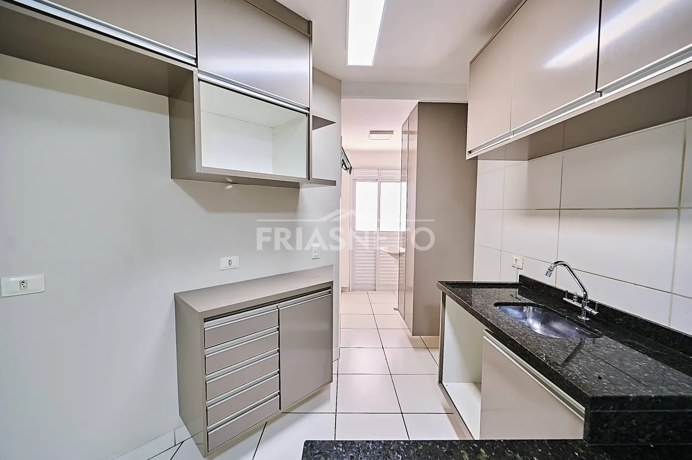 Cozinha com armários, área de serviço.