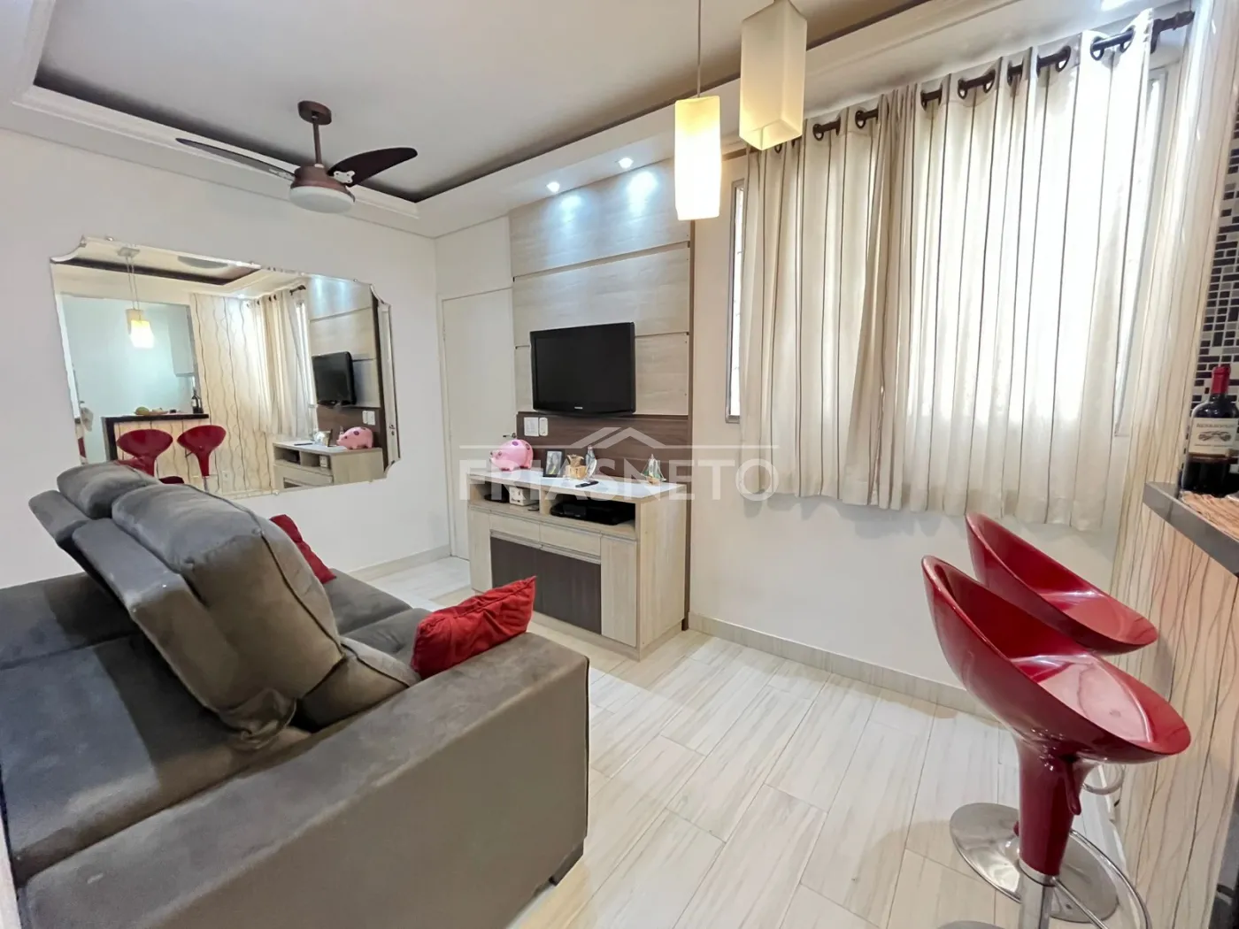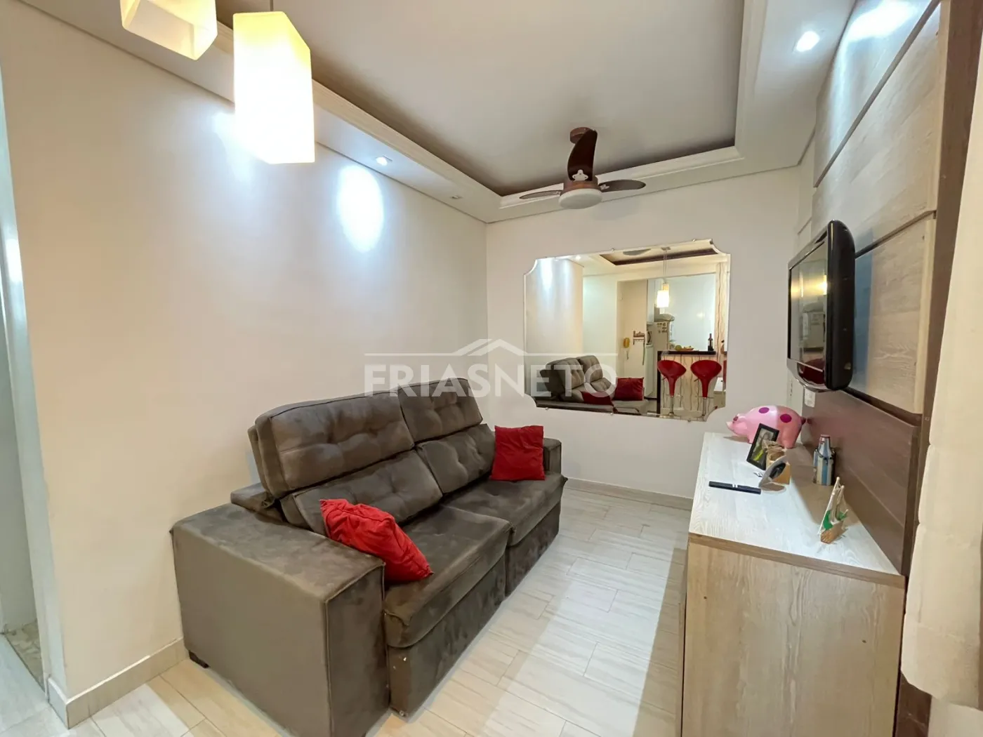 Sala: com painel de TV e ventilador de teto