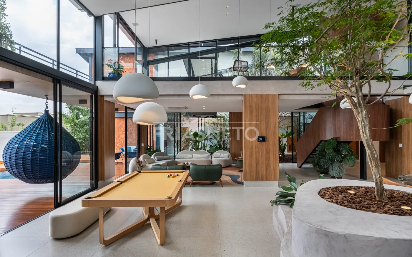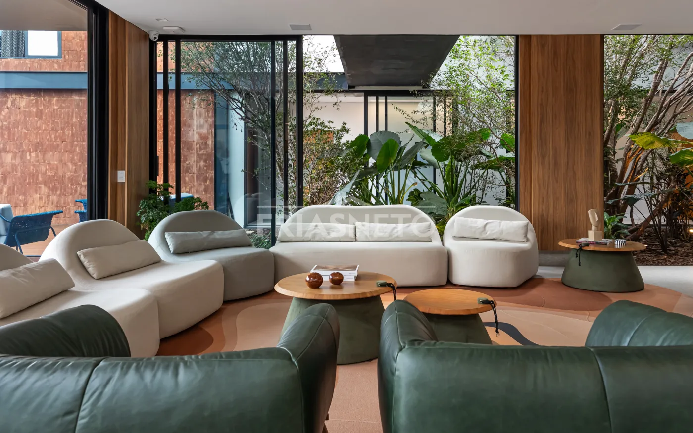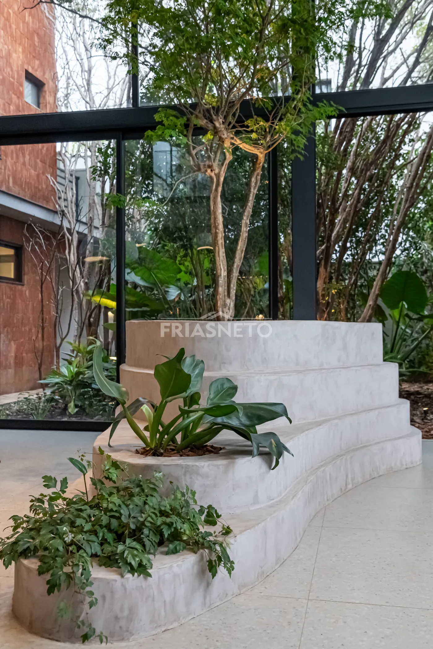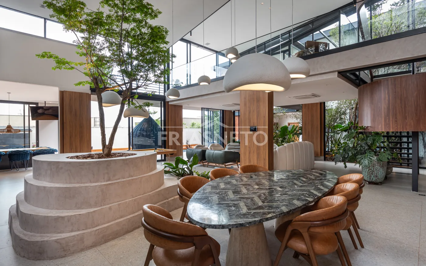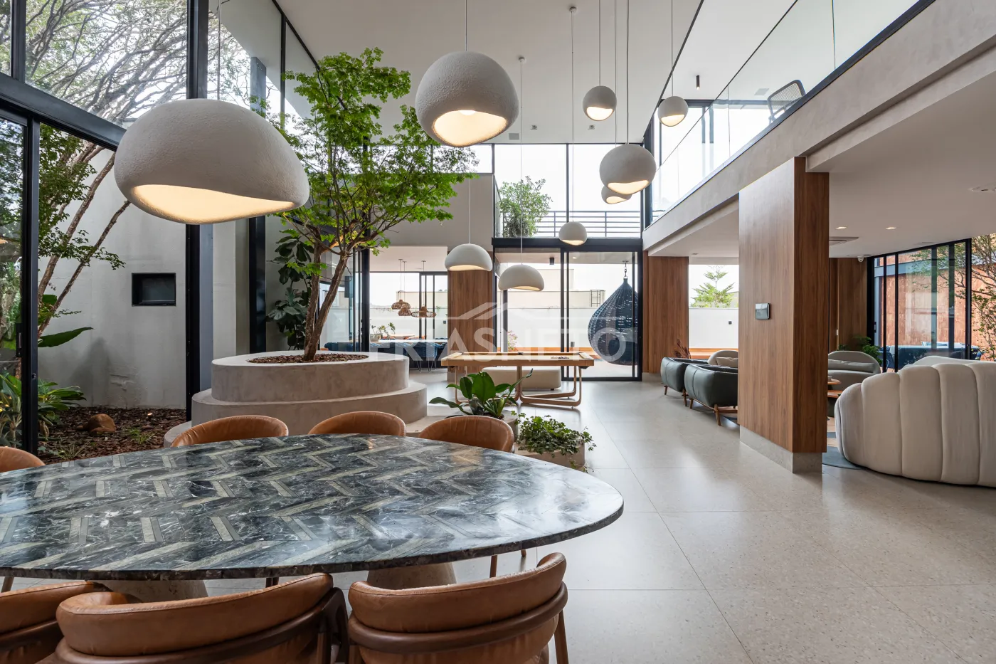 Praça interna com árvore tataré, trazendo leveza e conexão com a natureza.