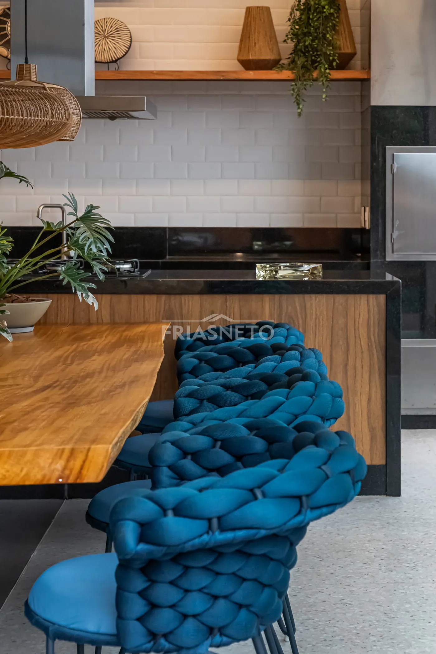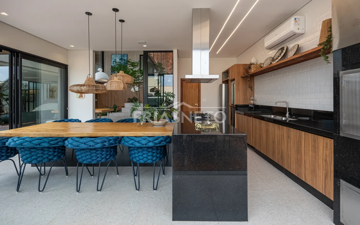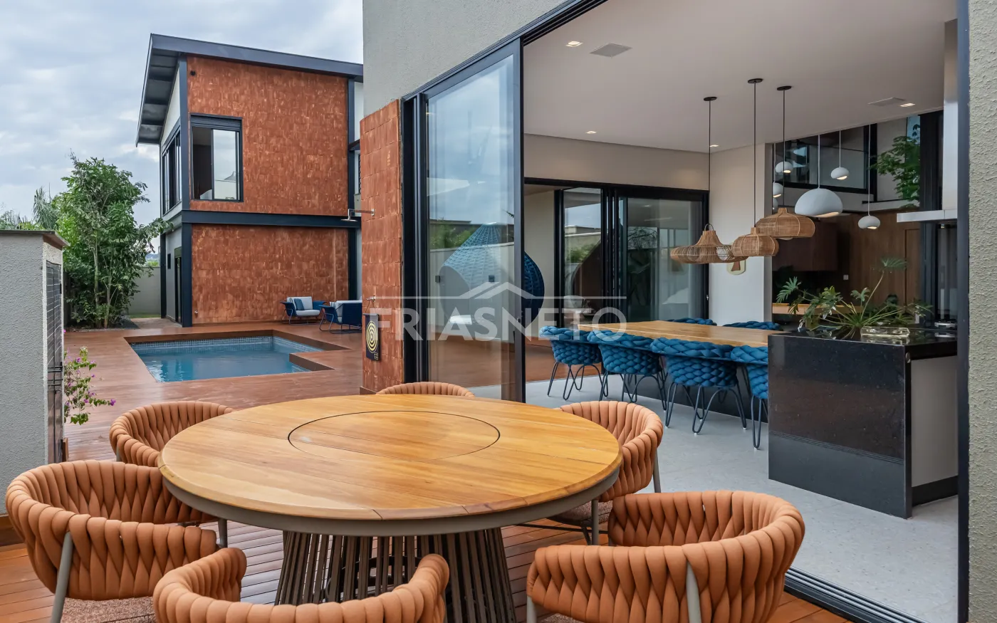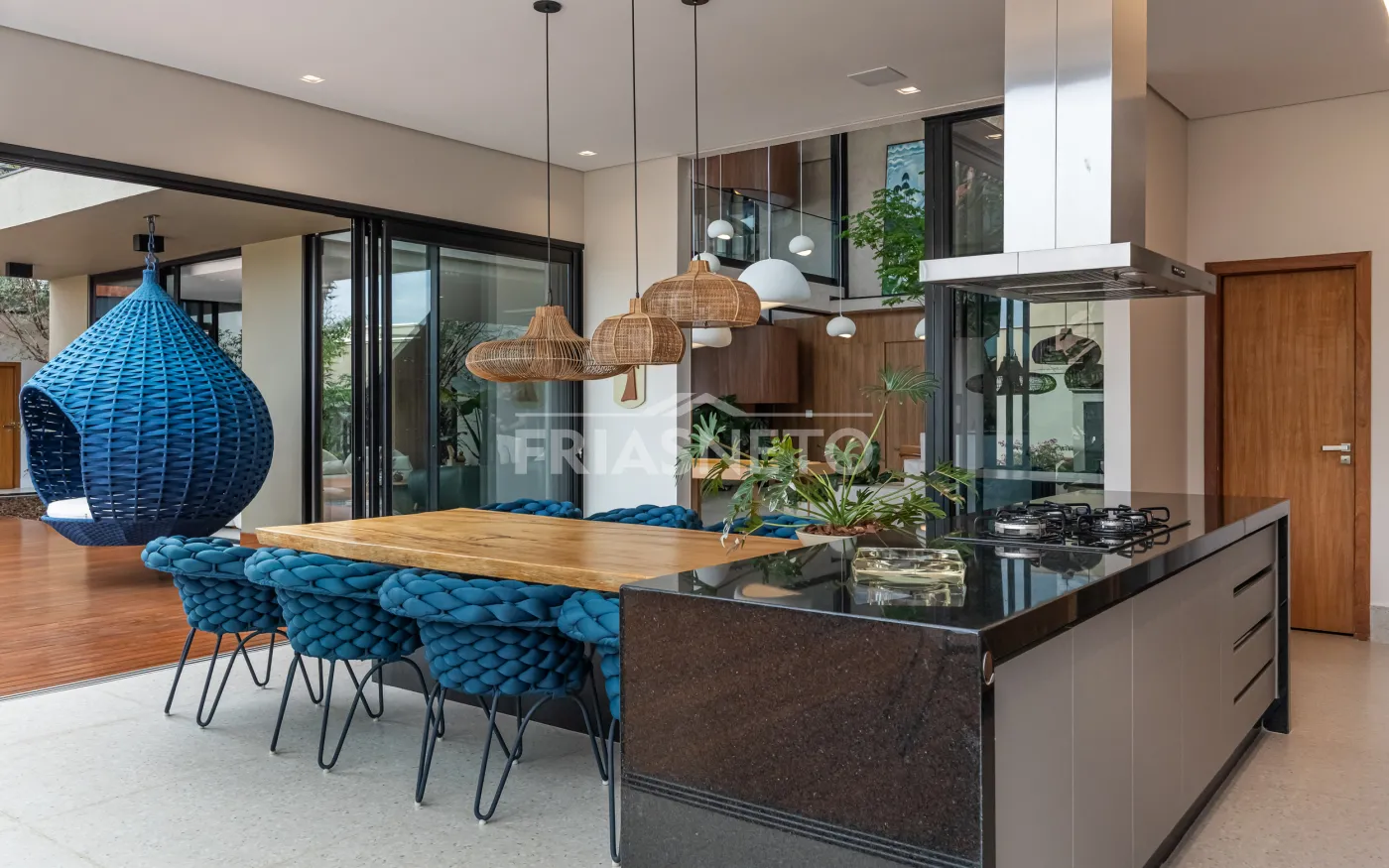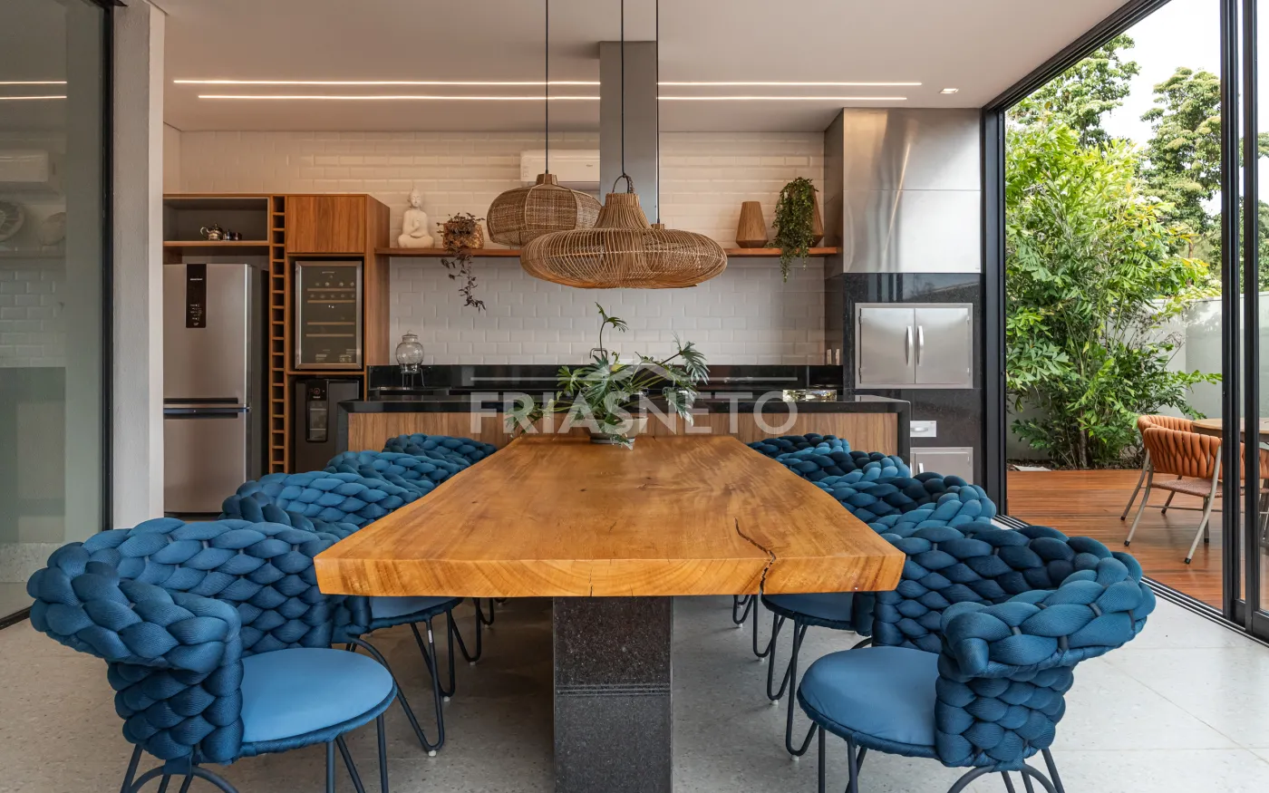 Área gourmet com mesa de madeira maciça e integração com os ambientes internos e externos.