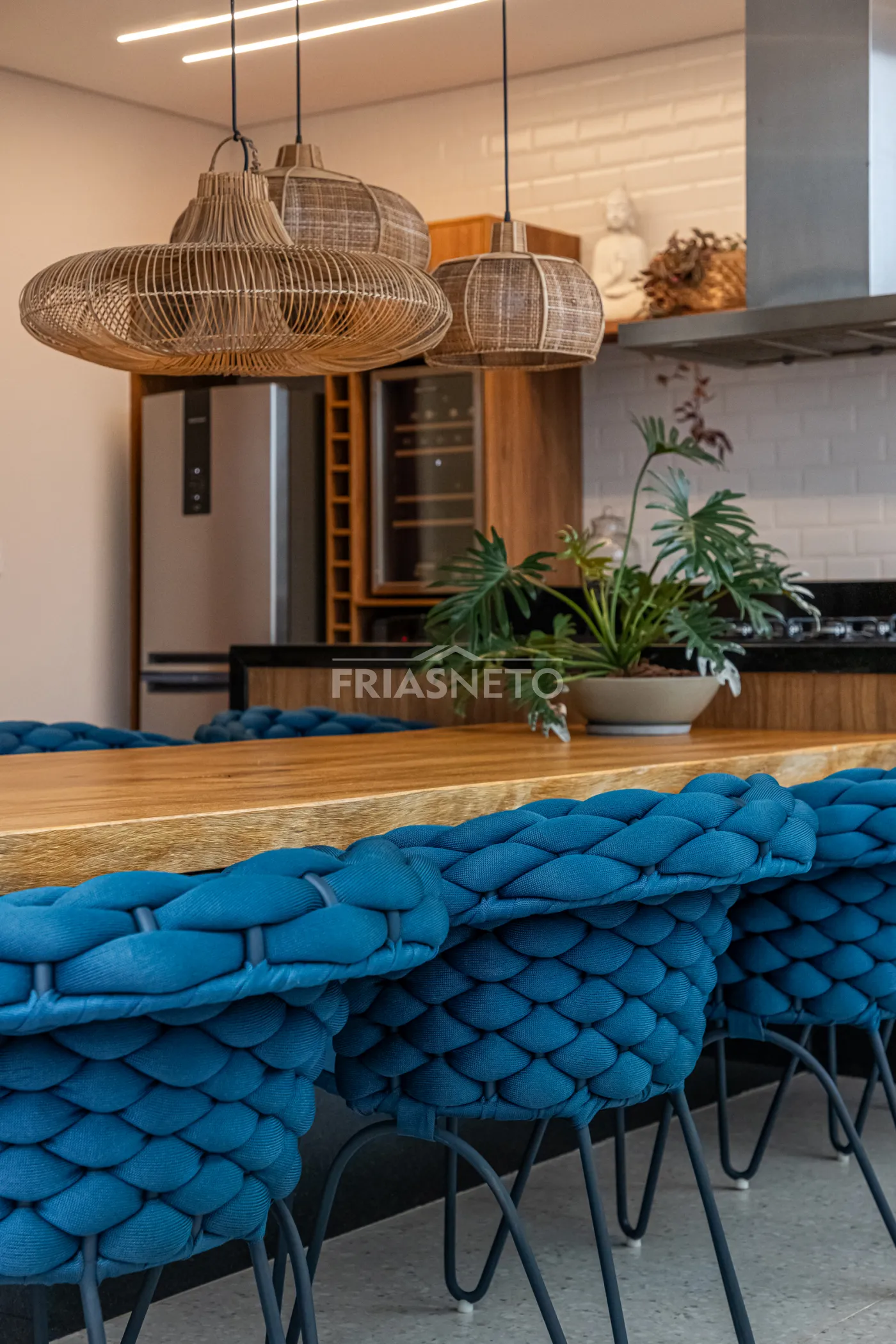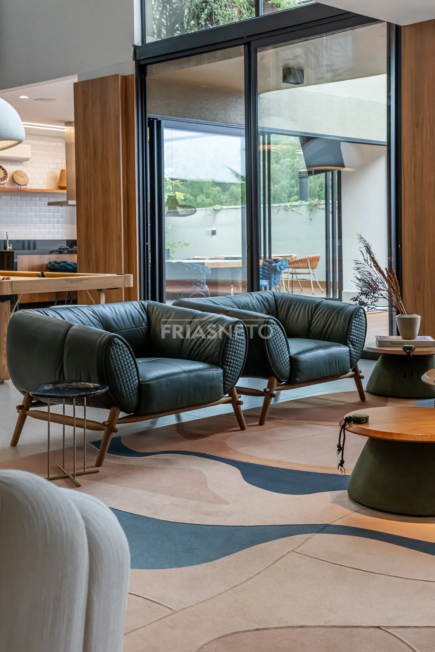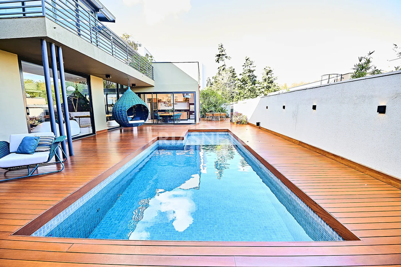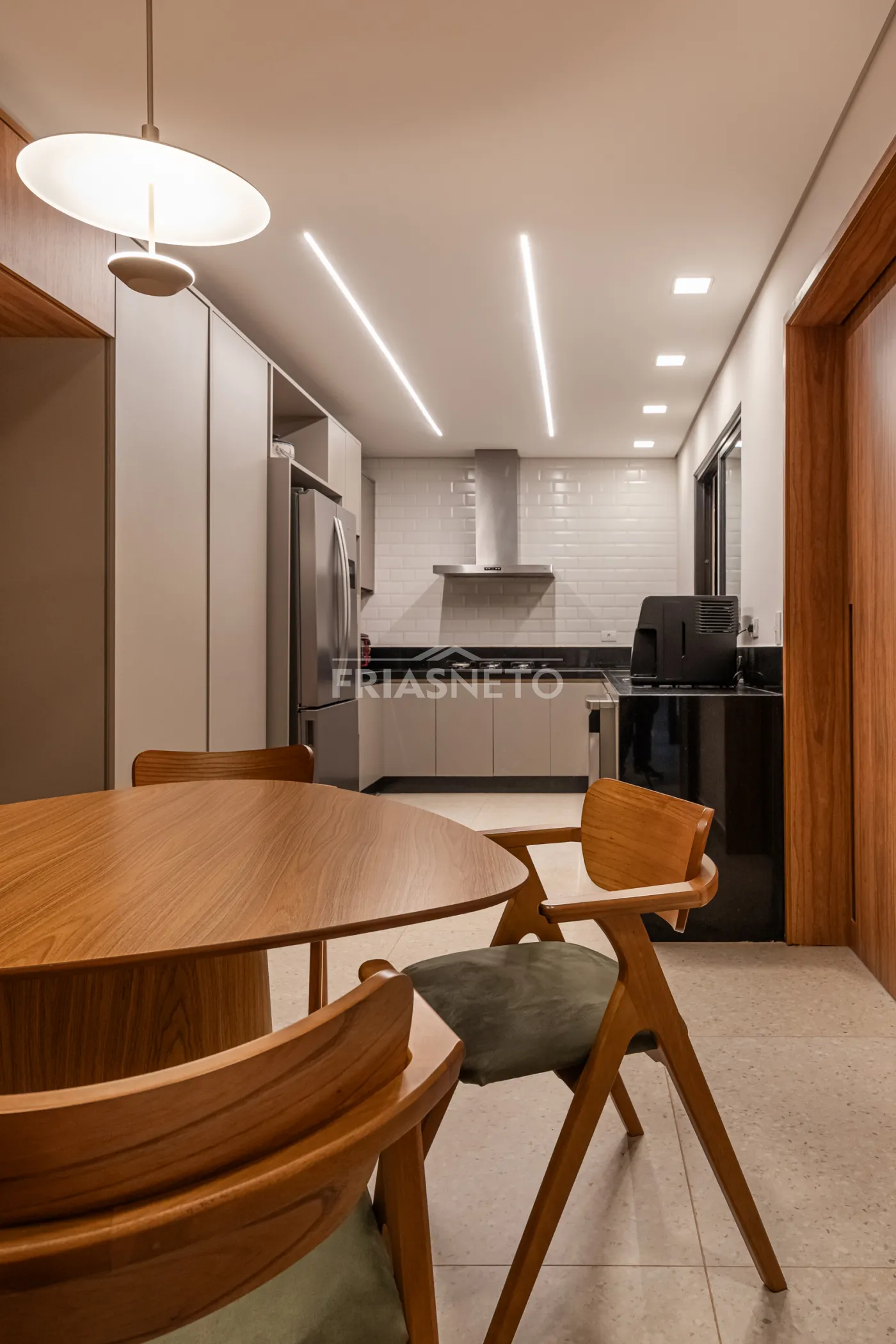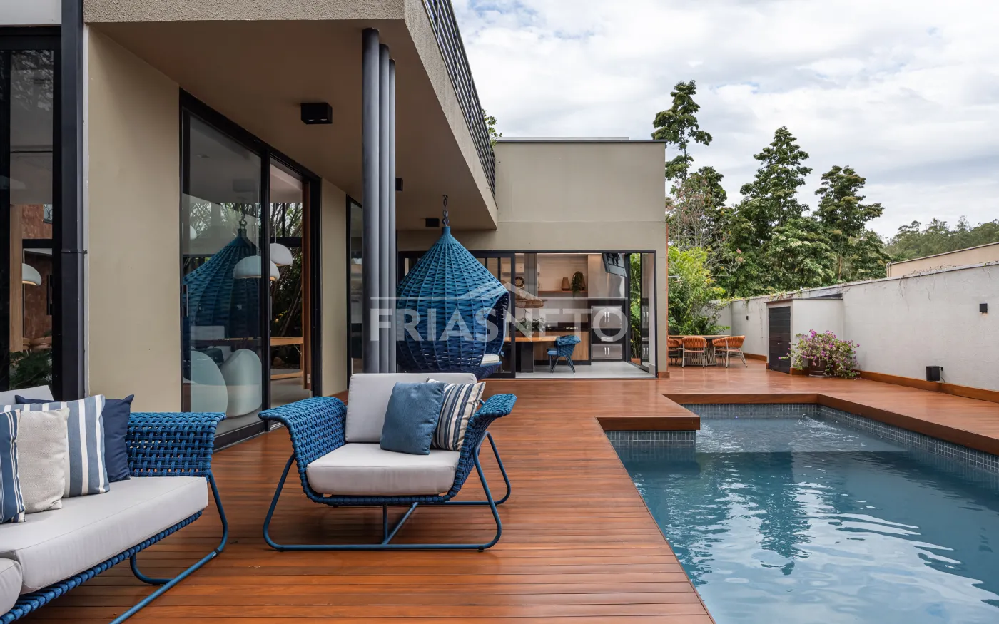 Área gourmet com mesa de madeira maciça e integração com os ambientes internos e externos.