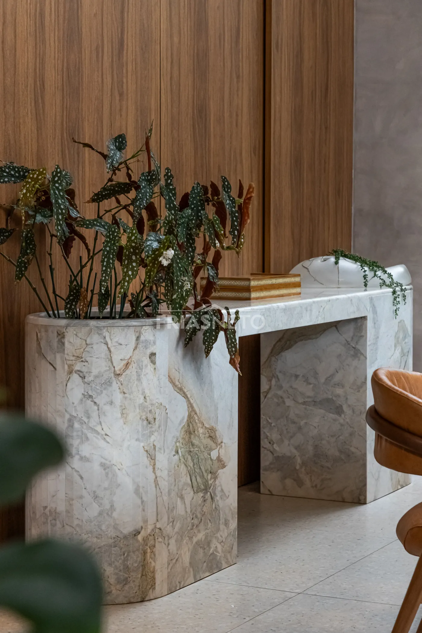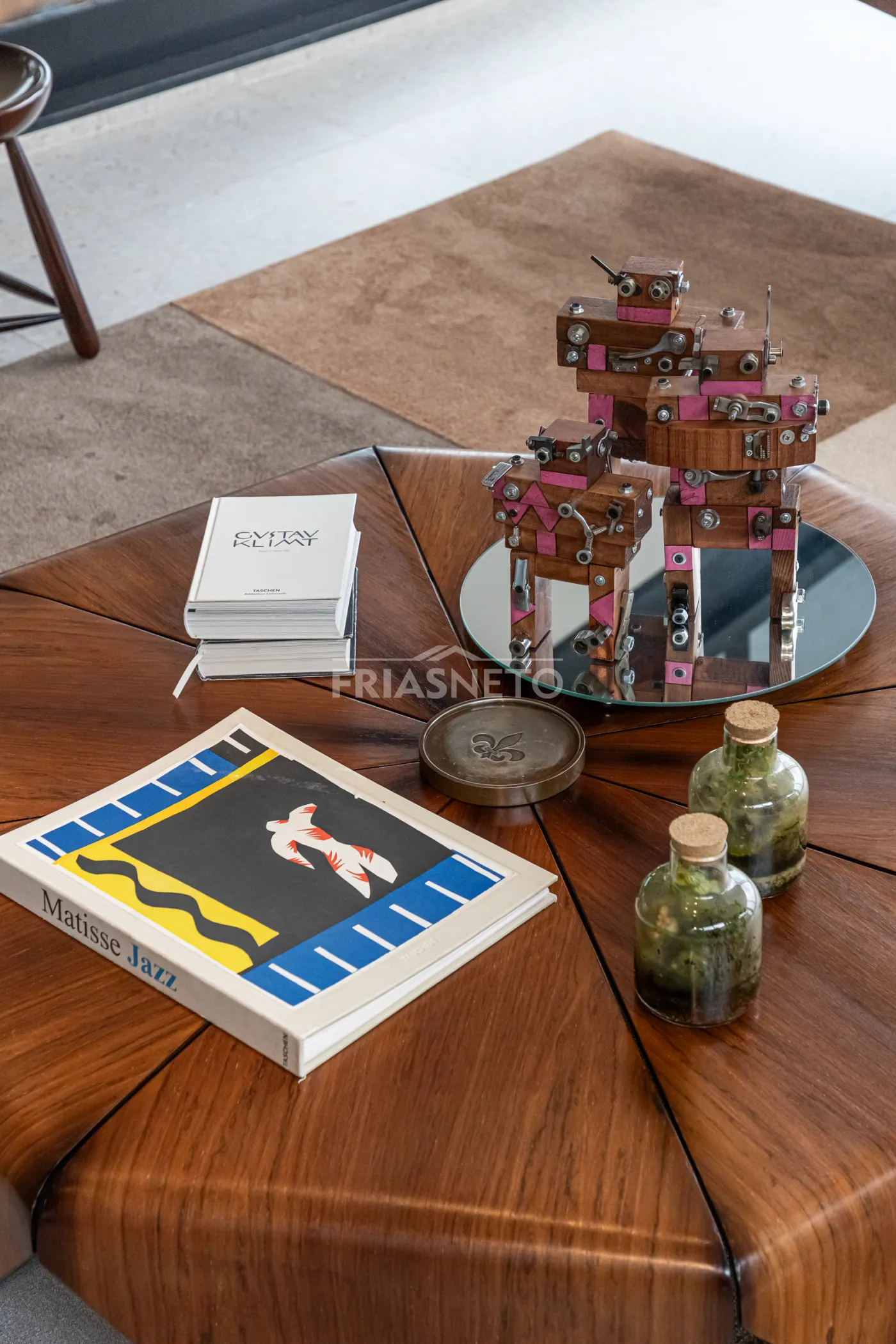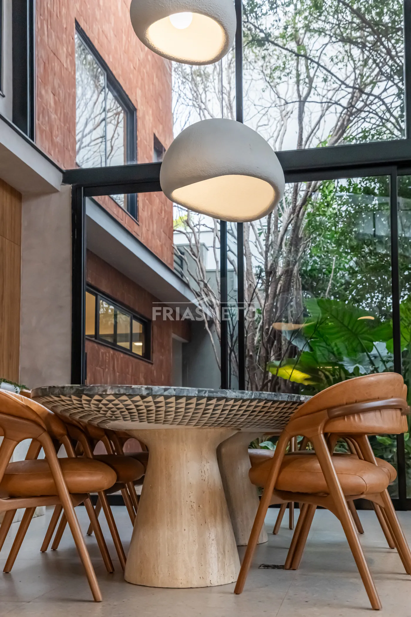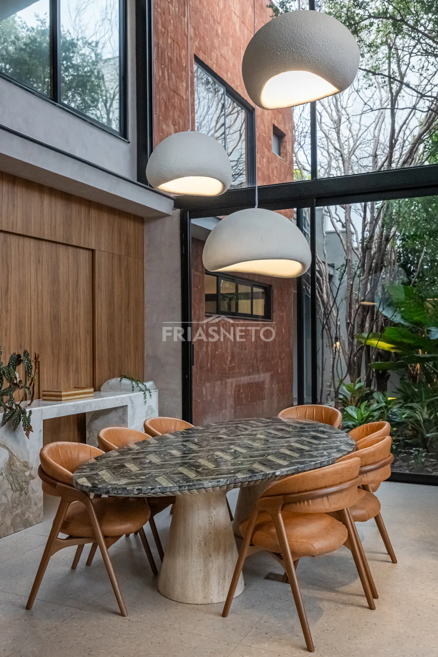 Sala de jantar com mesa em mármore marchetada.