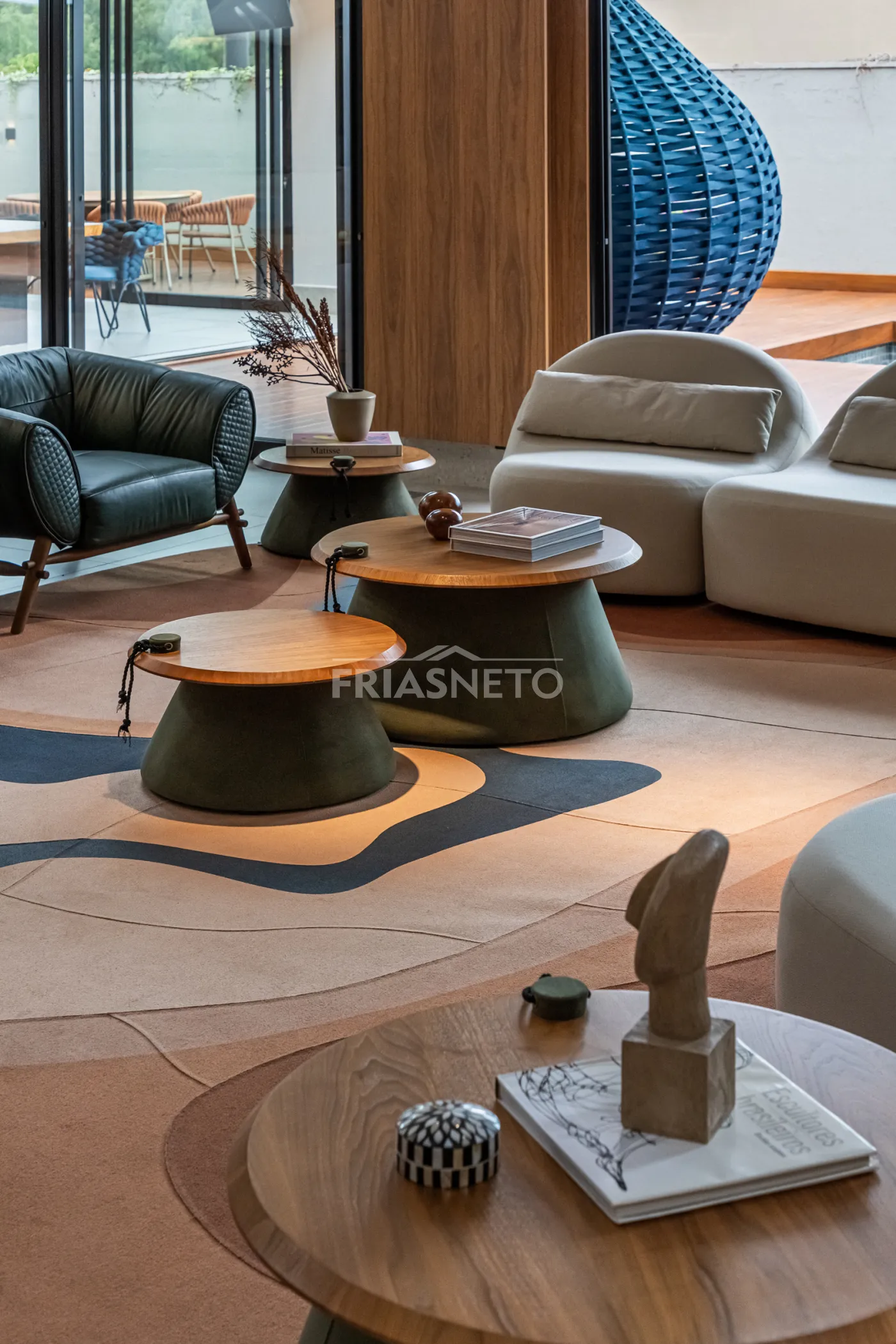 Sala de estar externa com mobiliário em corda náutica.