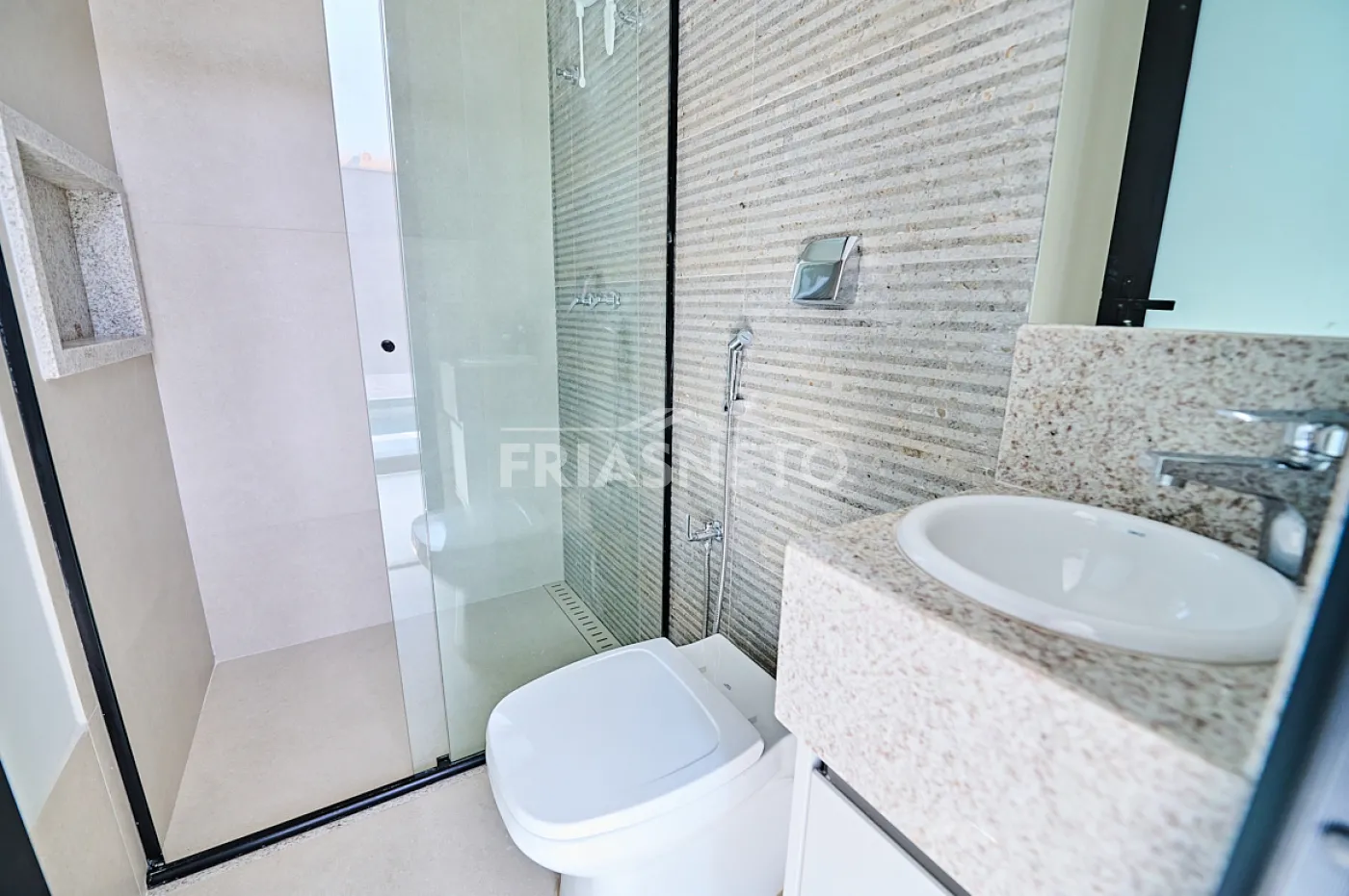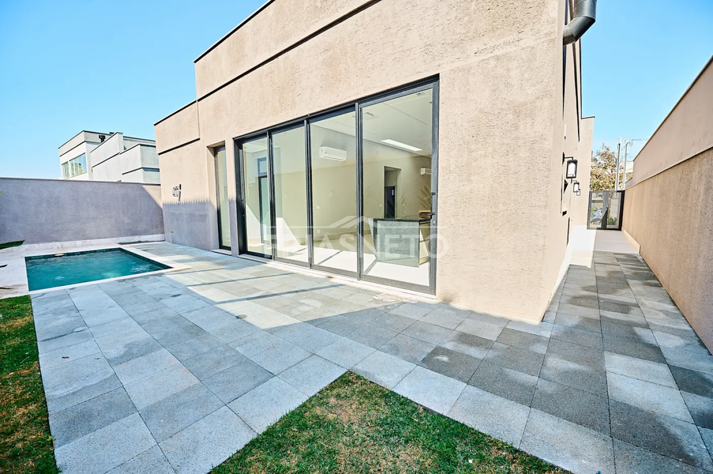 Casa térrea em condomínio de alto padrão, terreno 457,00 m2, com aproximadamente 250,00 m2 de construção, sendo: sala para 2 ambientes com ar condicionado, 3 suítes completas de armários e ar condicionado, espaço gourmet integrado com cozinha e área externa com piscina.