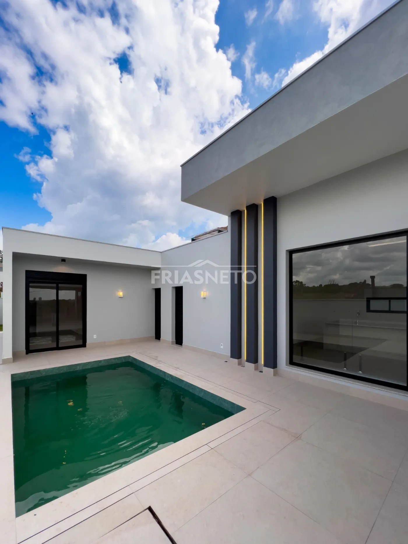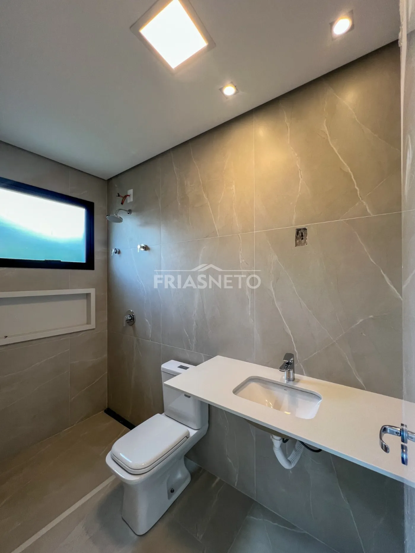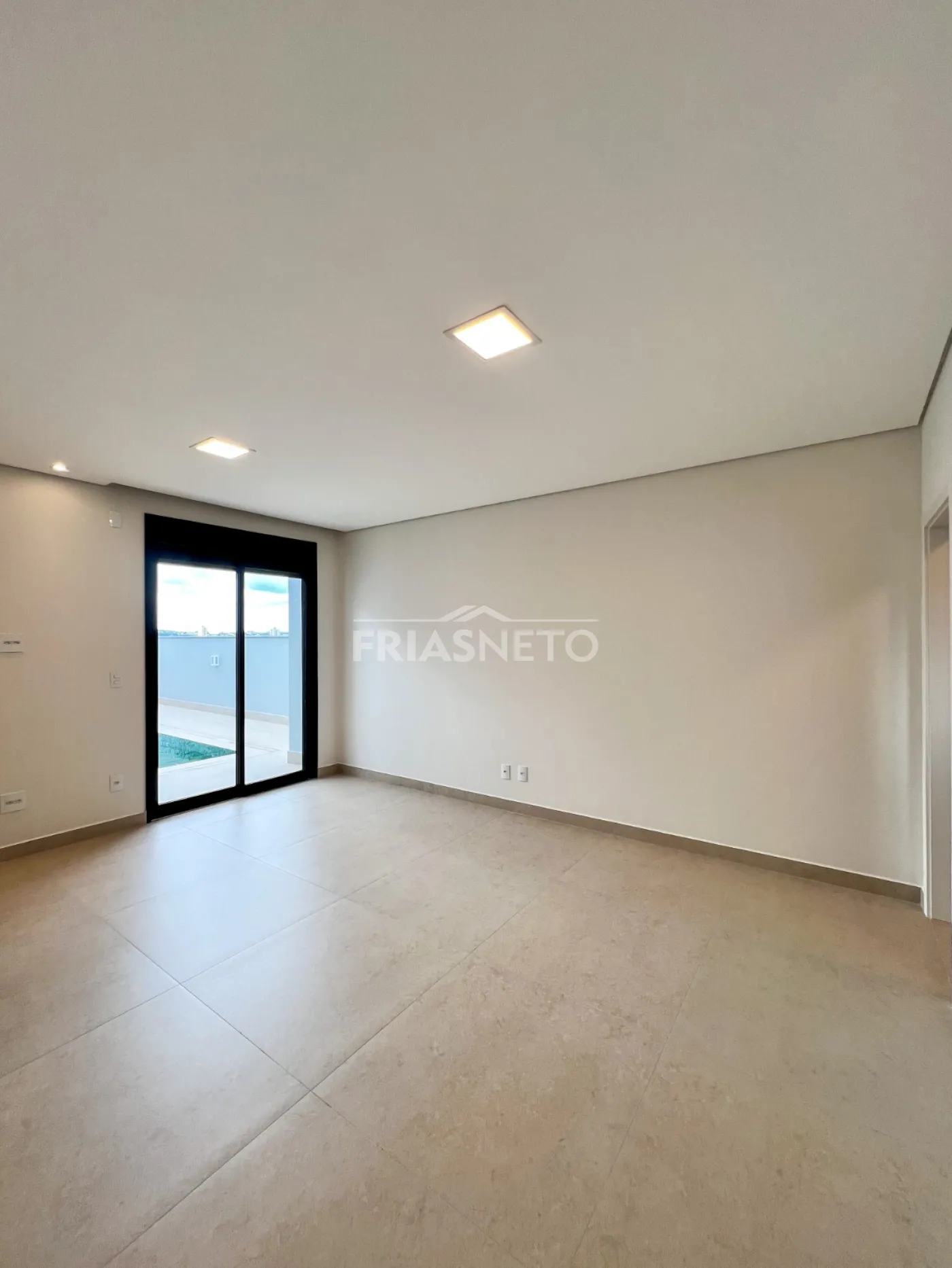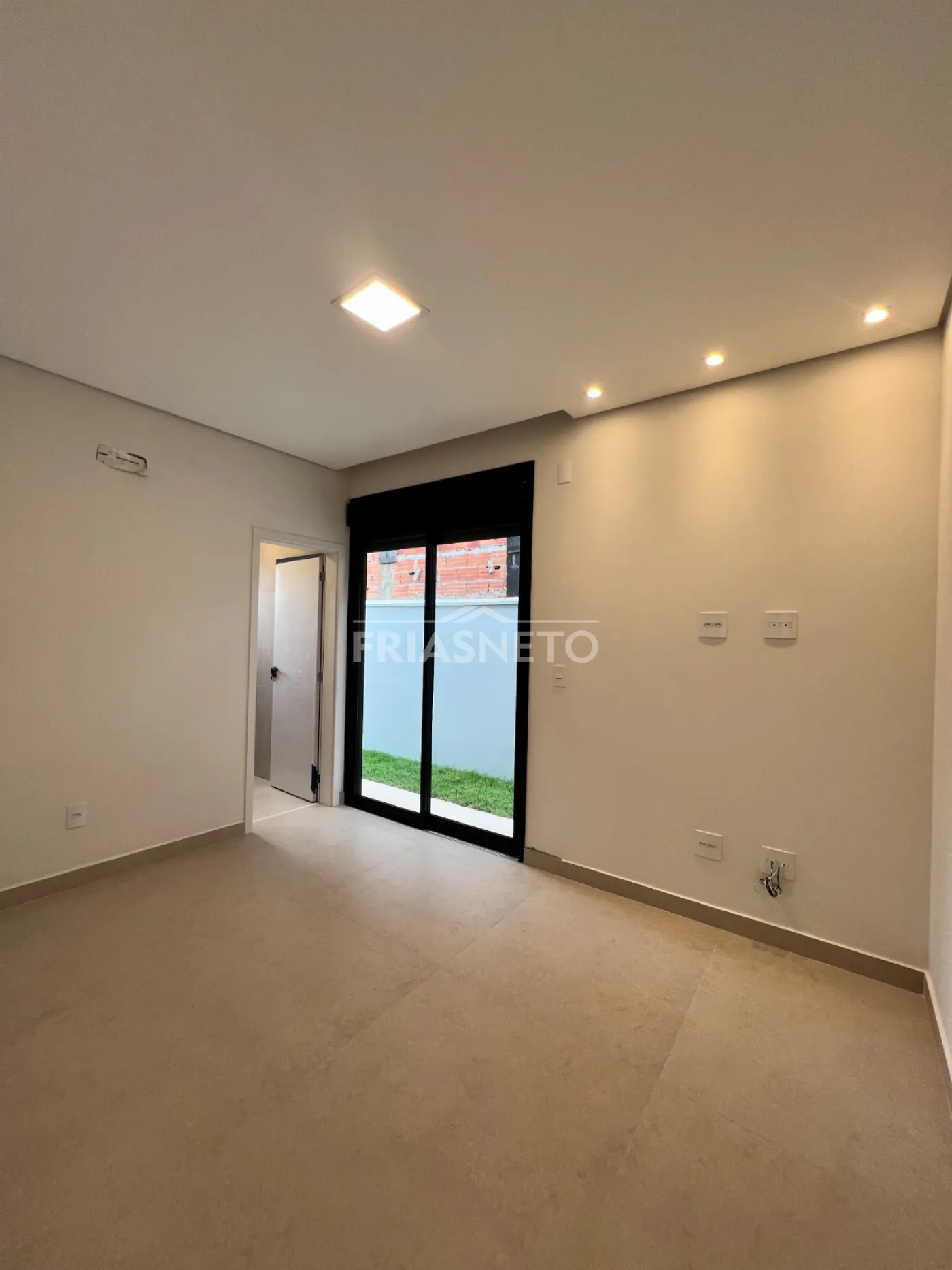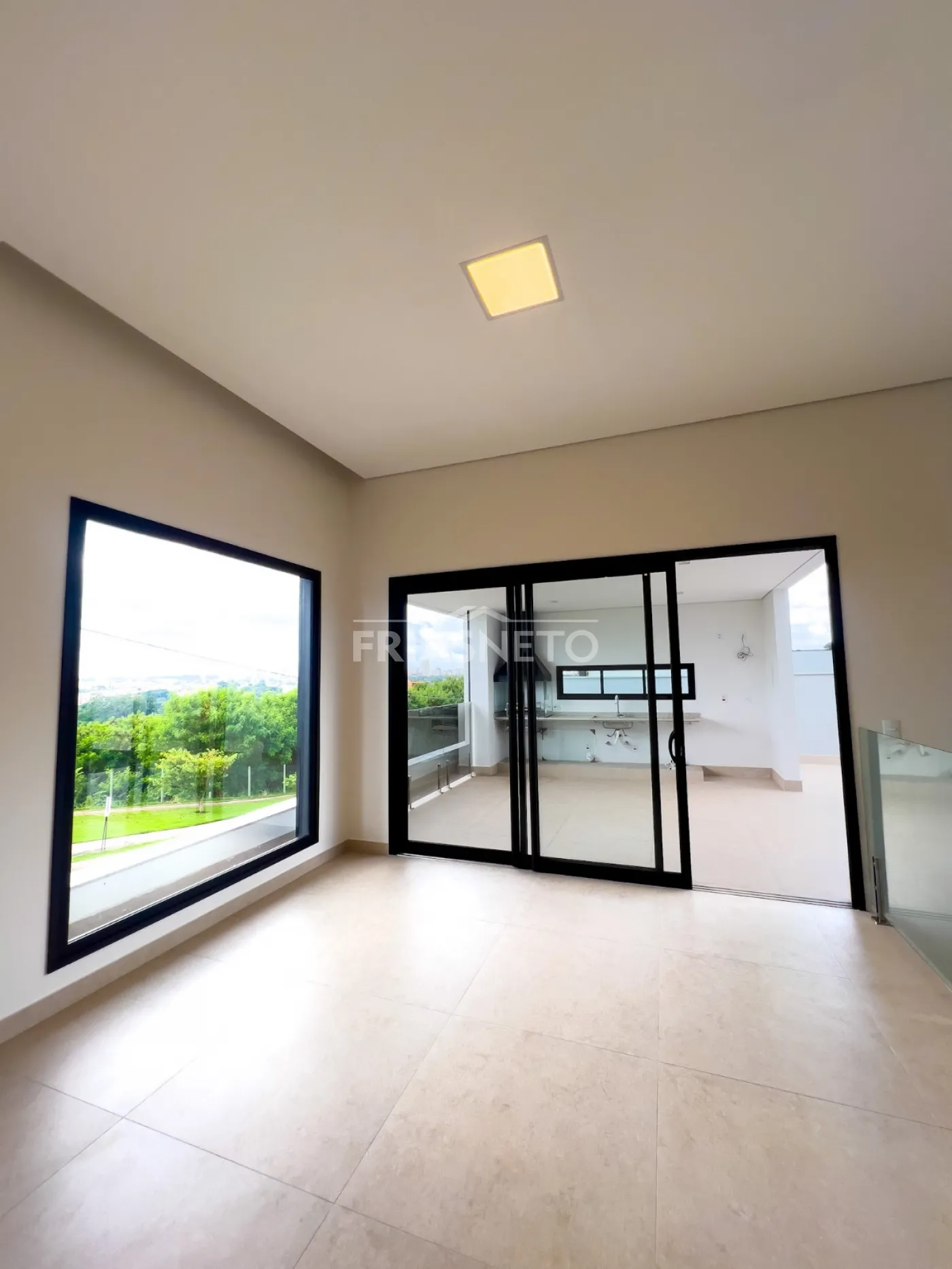 Infraestrutura para ar-condicionado, portas internas são portas de giro e de correr, com pintura branca industrial de alto padrão. Nos dormitórios são persianas integradas de PVC, com motor por acionamento de controle remoto, todas as demais esquadrias da casa em Alumínio Preto, linha Suprema e Gold, além de forro de gesso em toda a casa com iluminação.