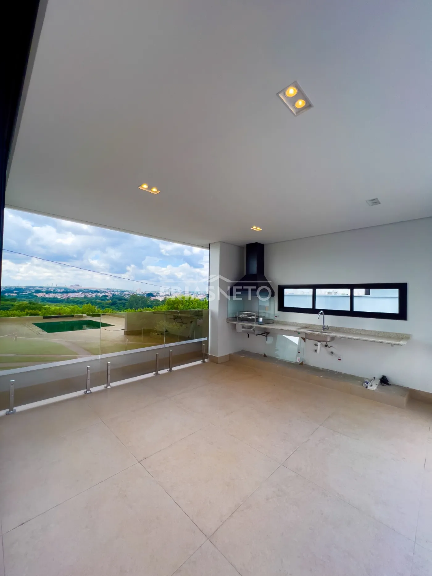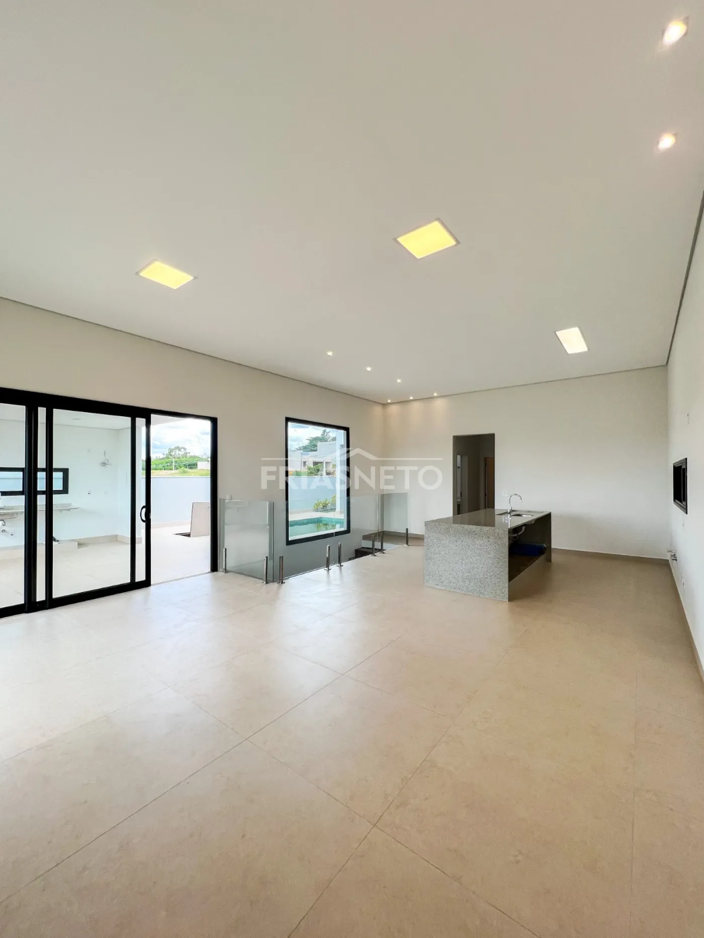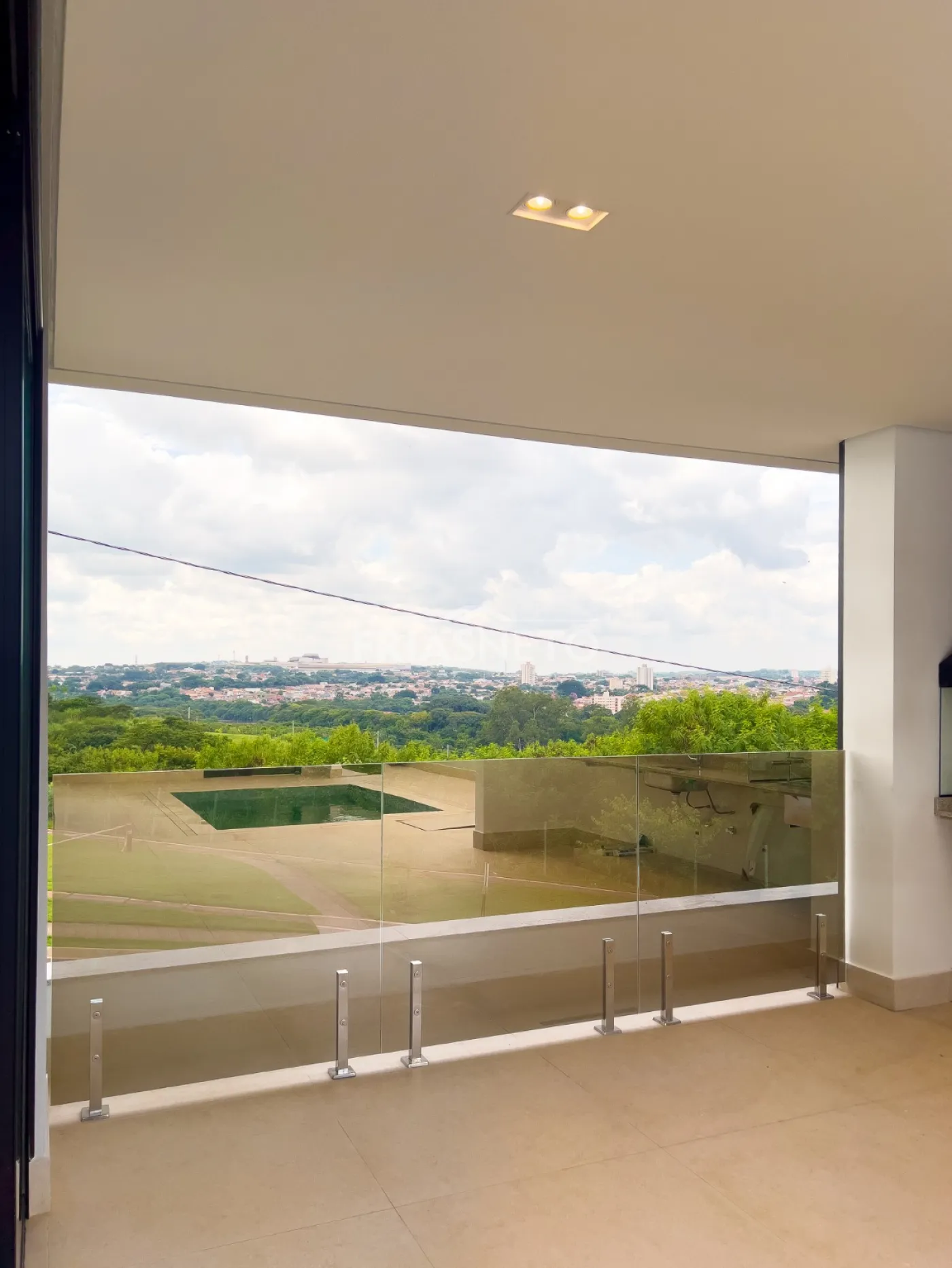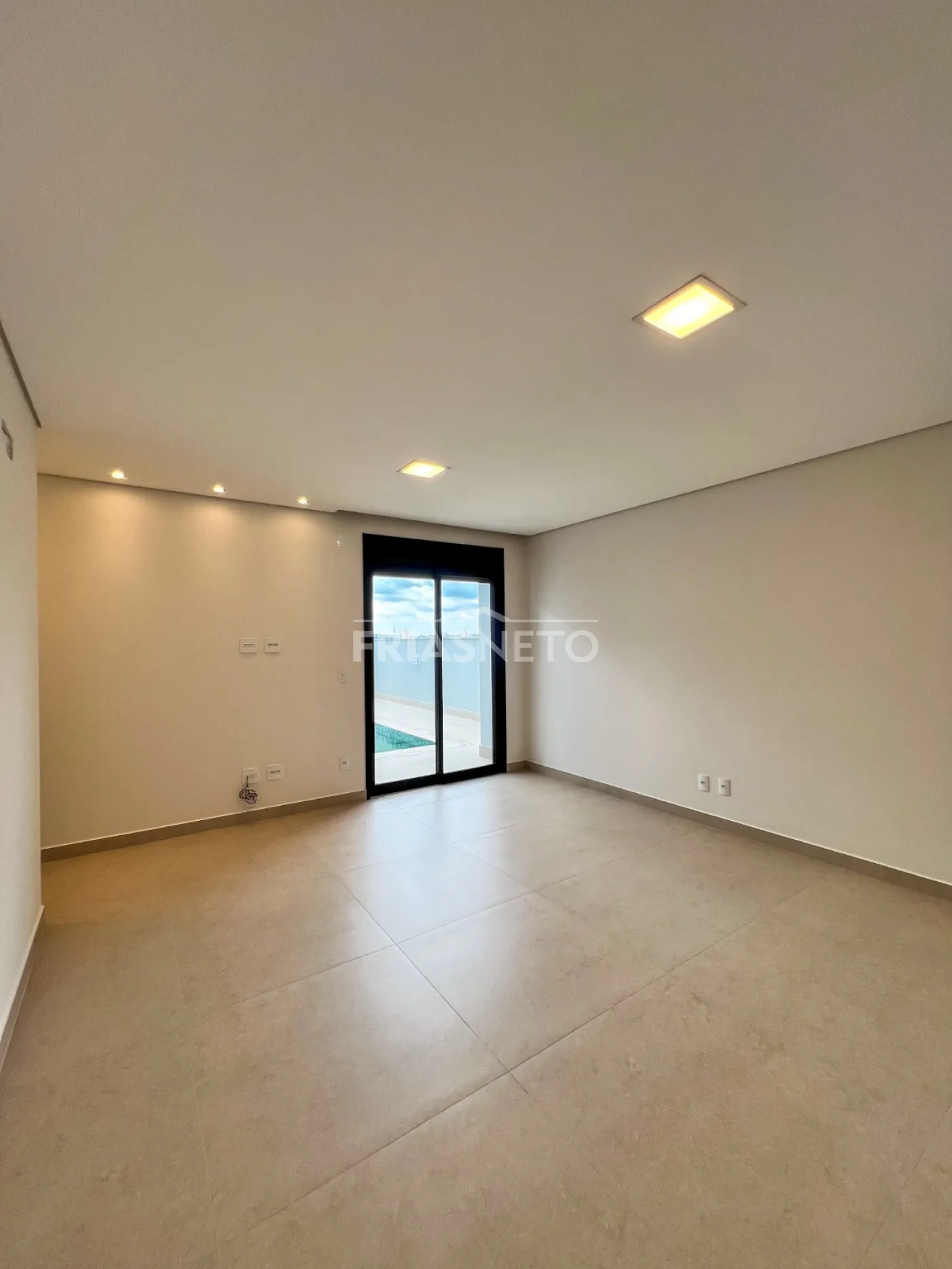 Infraestrutura para ar-condicionado, portas internas são portas de giro e de correr, com pintura branca industrial de alto padrão. Nos dormitórios são persianas integradas de PVC, com motor por acionamento de controle remoto, todas as demais esquadrias da casa em Alumínio Preto, linha Suprema e Gold, além de forro de gesso em toda a casa com iluminação.