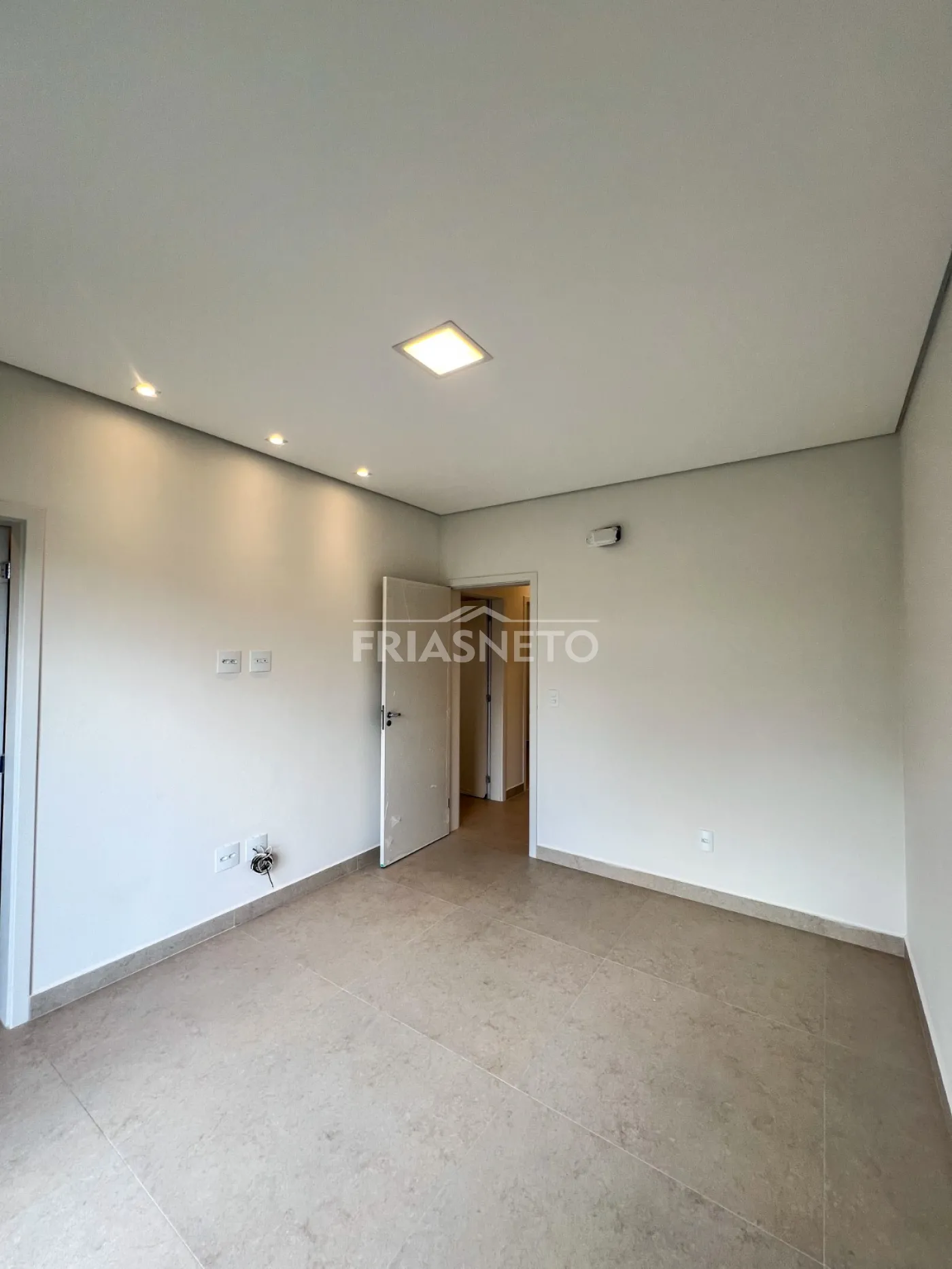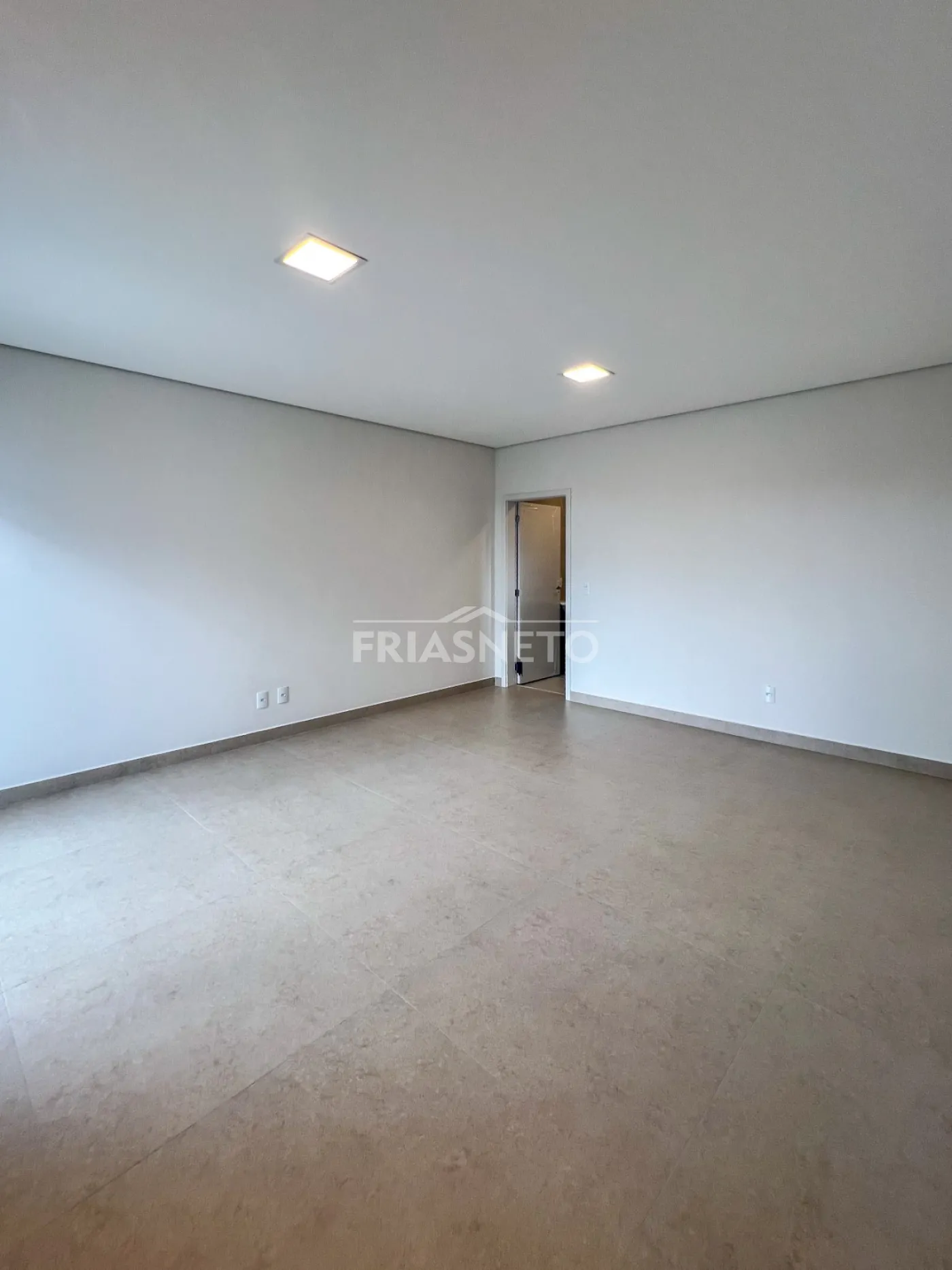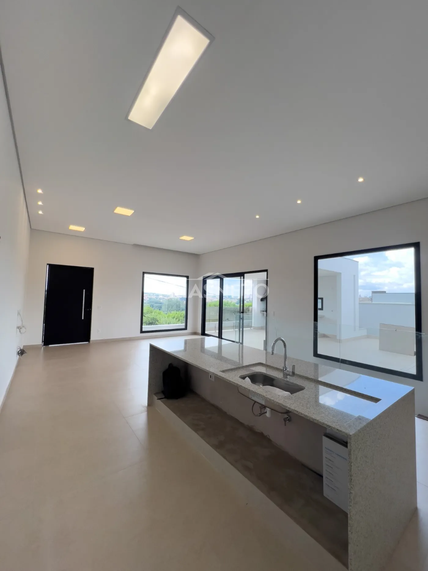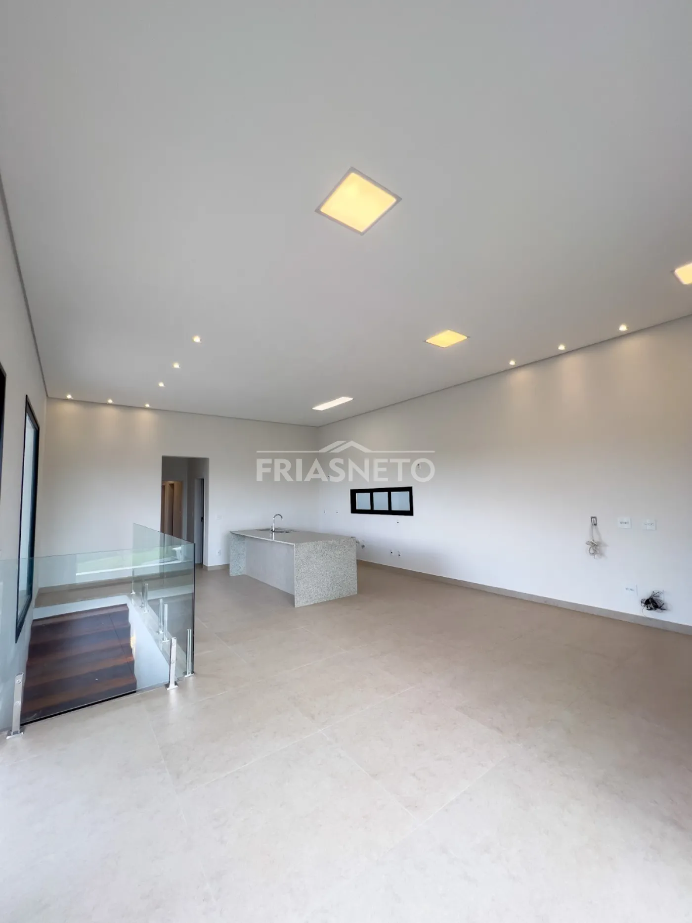 Infraestrutura para ar-condicionado, portas internas são portas de giro e de correr, com pintura branca industrial de alto padrão. Nos dormitórios são persianas integradas de PVC, com motor por acionamento de controle remoto, todas as demais esquadrias da casa em Alumínio Preto, linha Suprema e Gold, além de forro de gesso em toda a casa com iluminação.