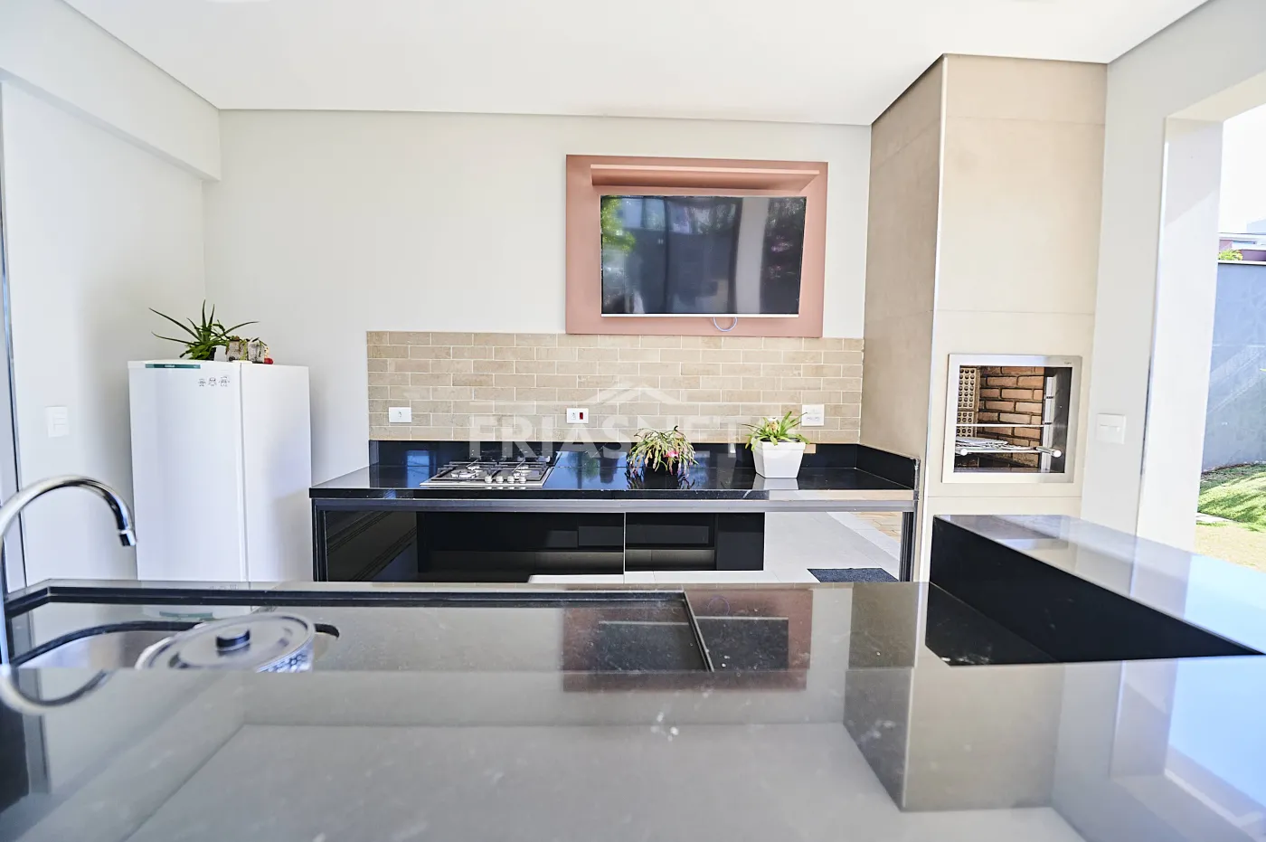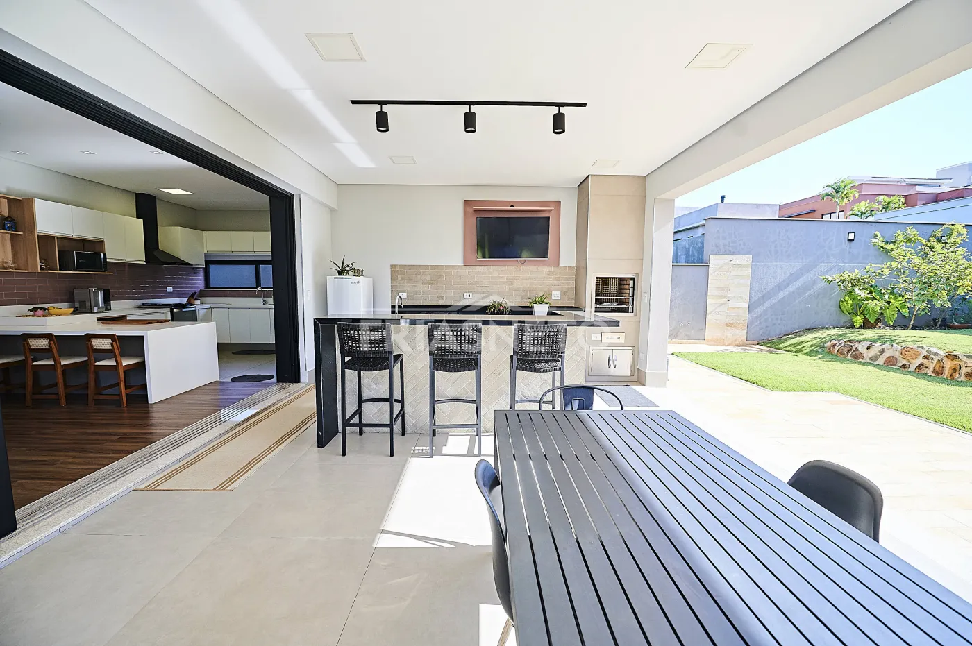 - Espaço gourmet completo, com churrasqueira, balcão em granito e vista para a piscina;