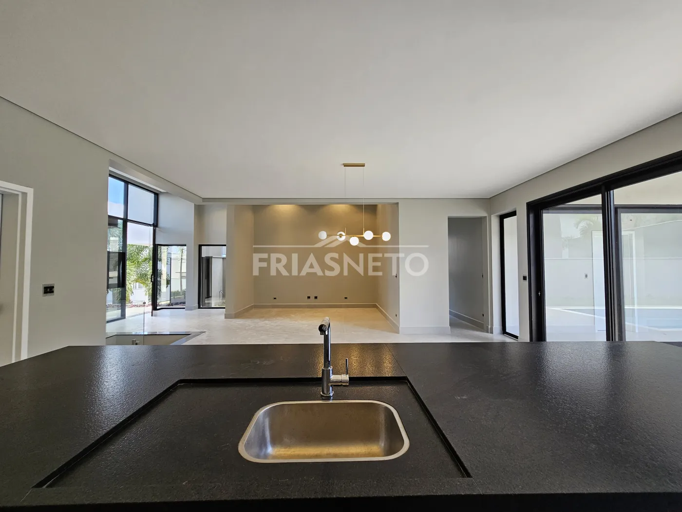 -Cozinha moderna com ilha central e totalmente integrada à área social