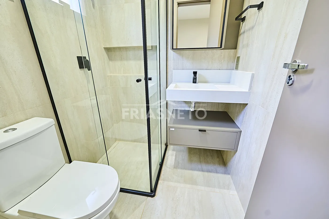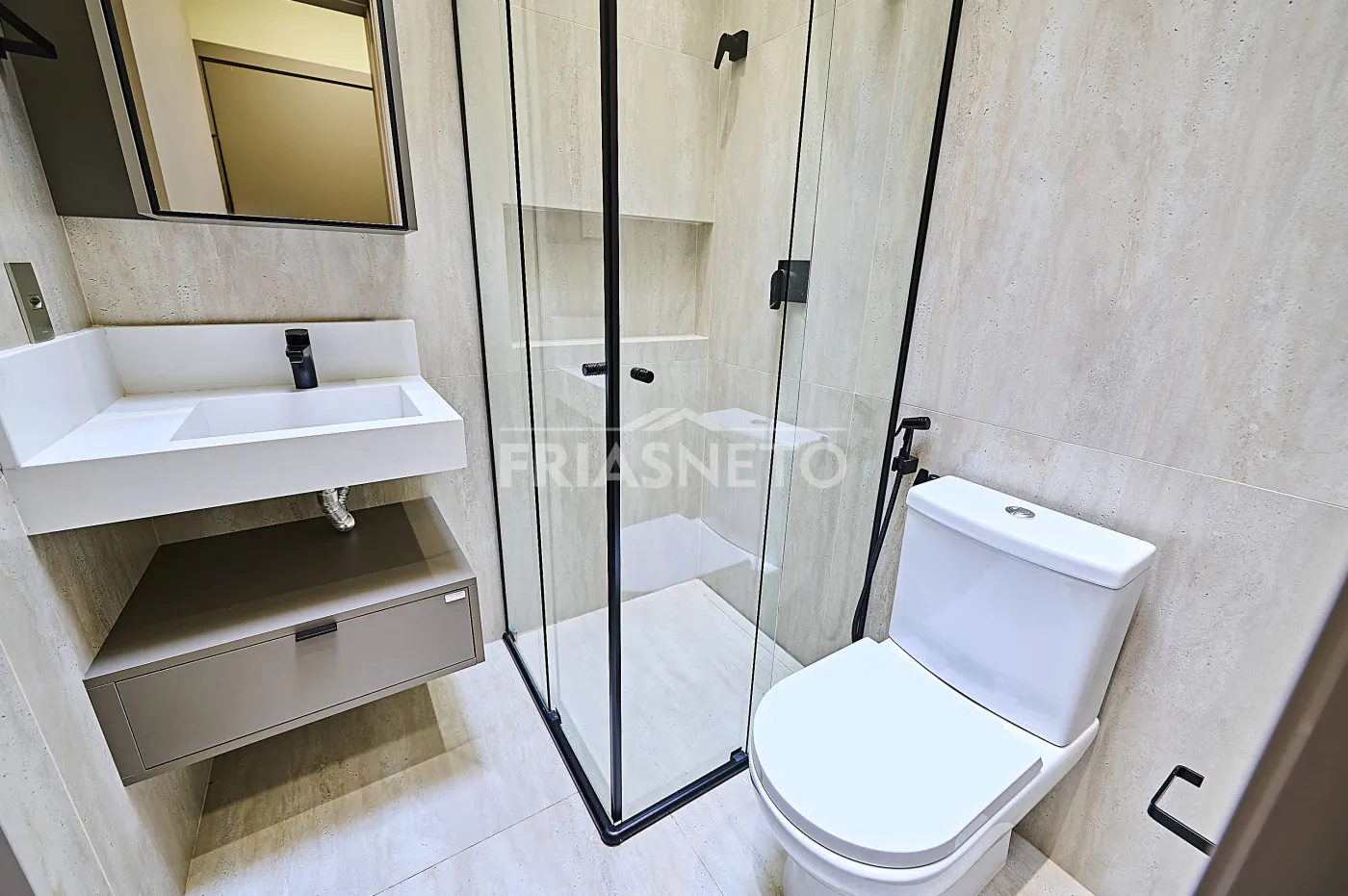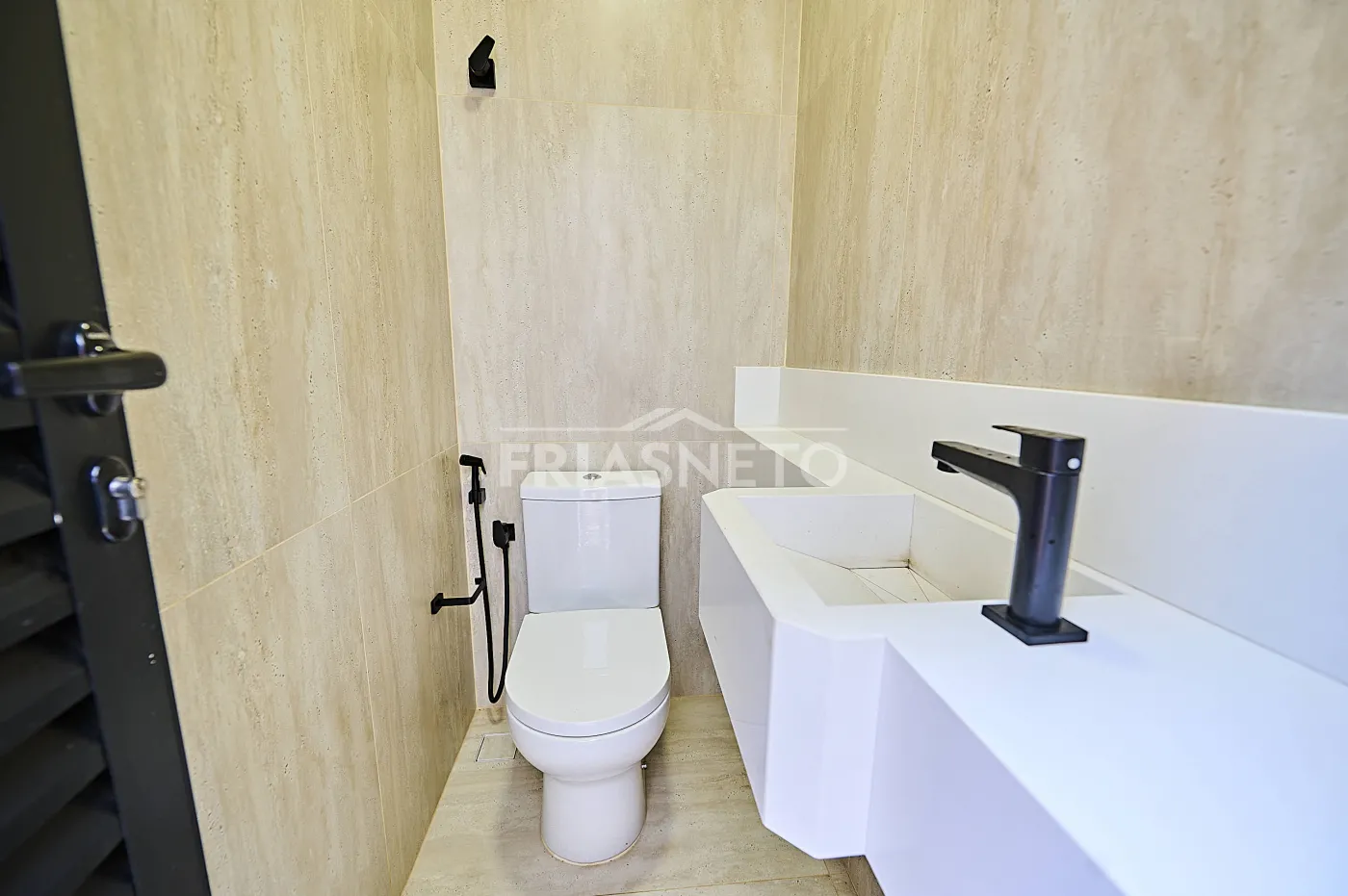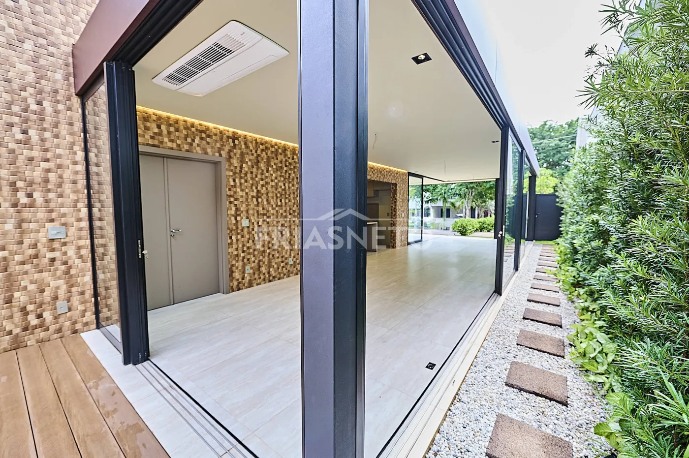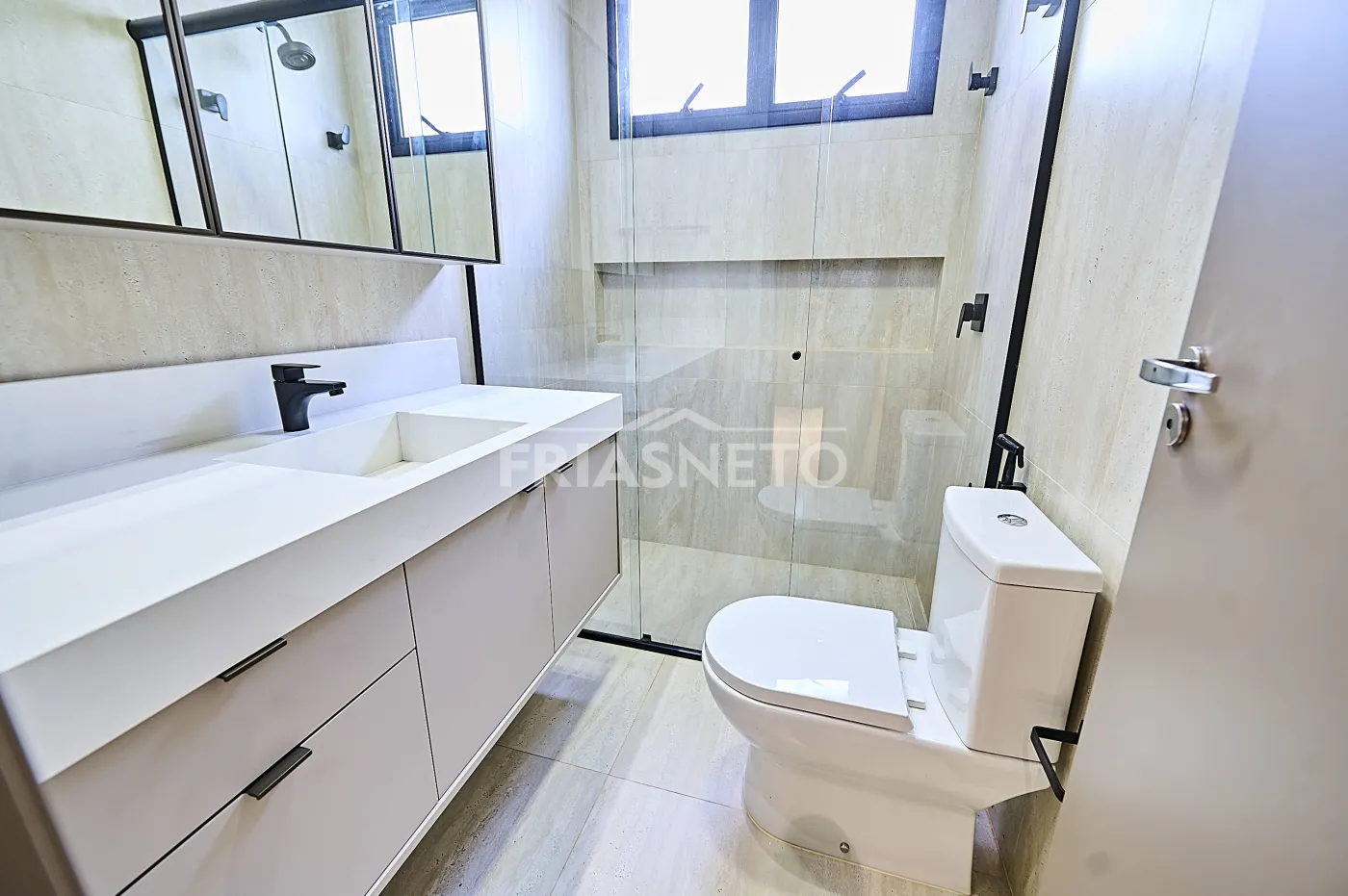 São 3 suítes, 5 banheiros ao todo, ar-condicionado em todos os ambientes e acabamentos de bom