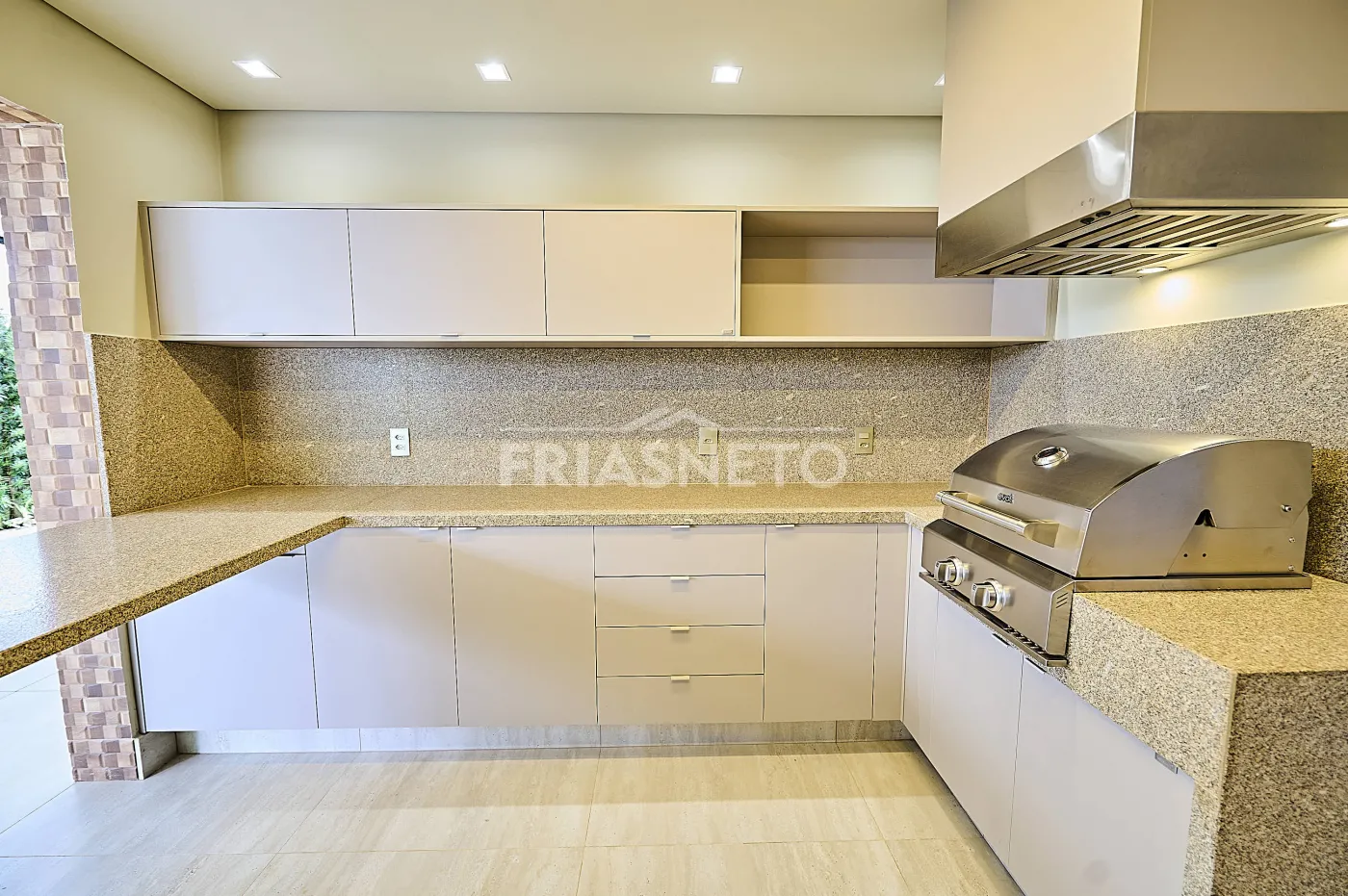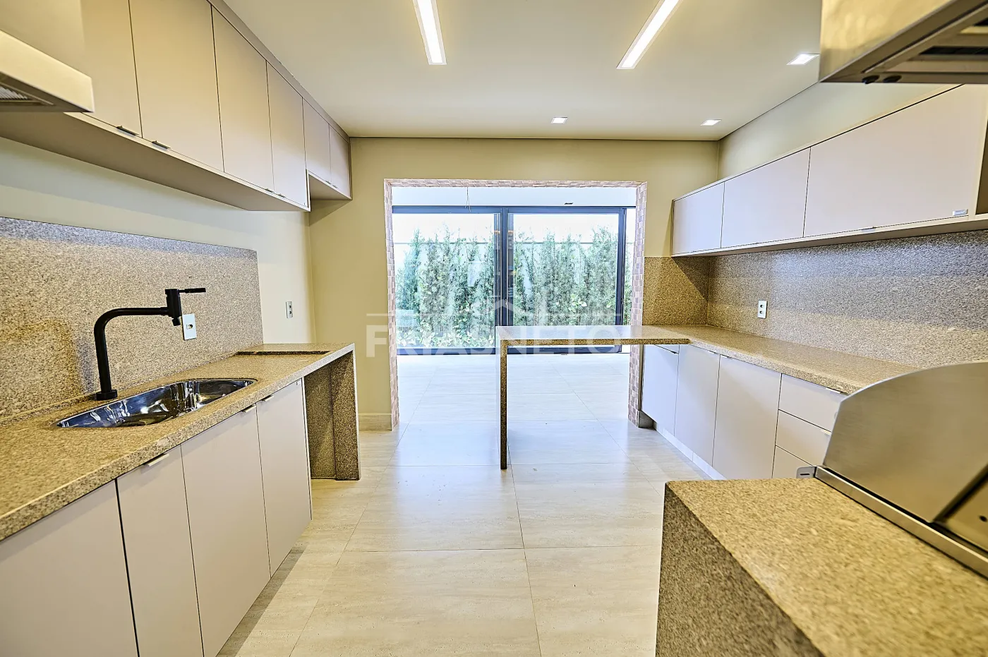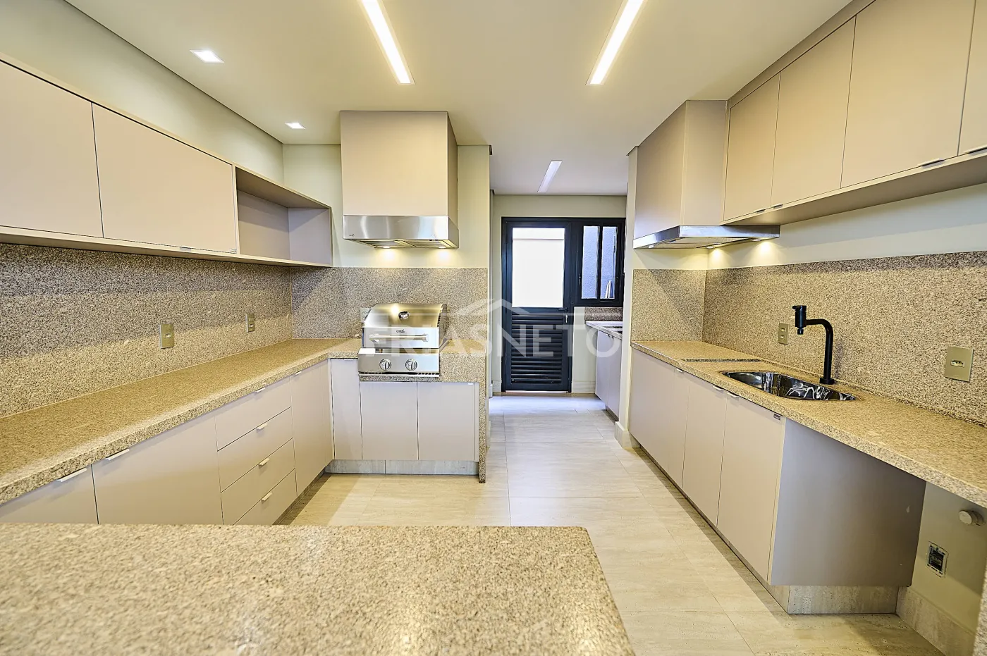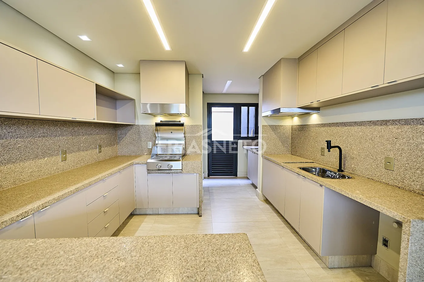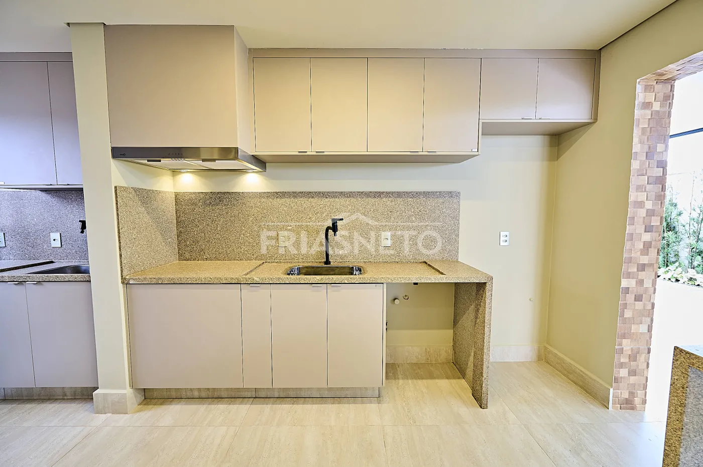 laqueadas na cor fendi. A cozinha oferece ótima área de armazenamento e conta com