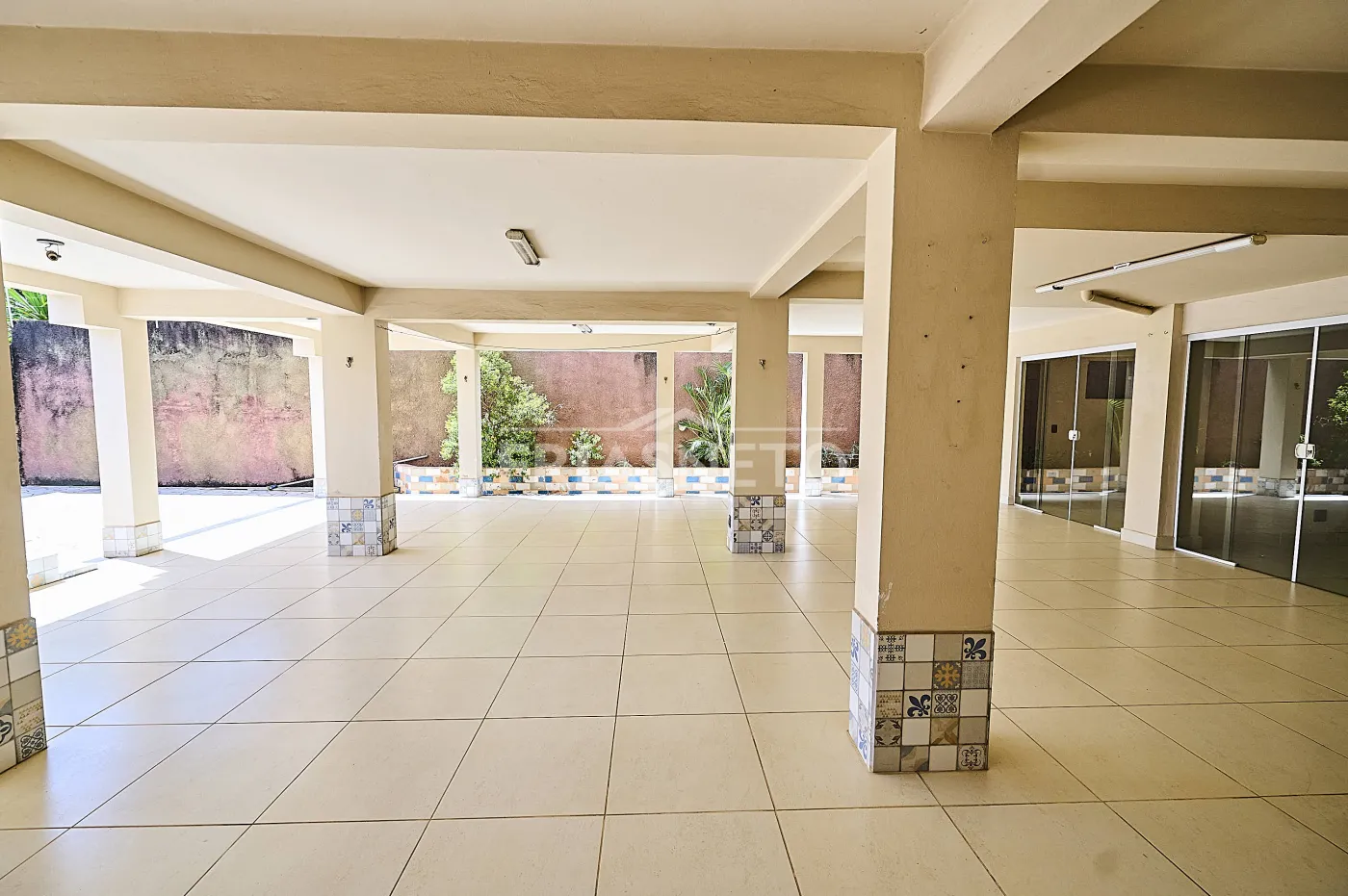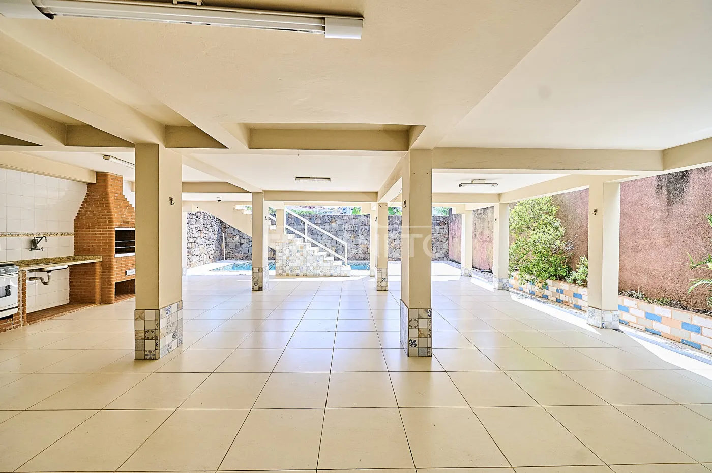 Piscina com salão de festas e espaço gourmet.