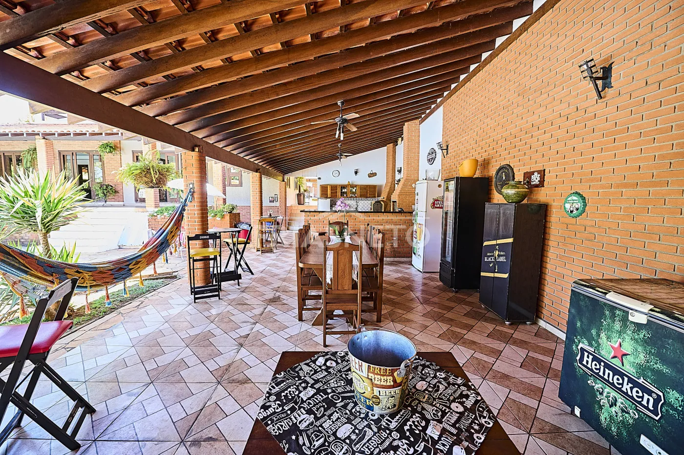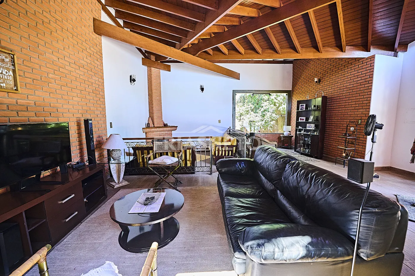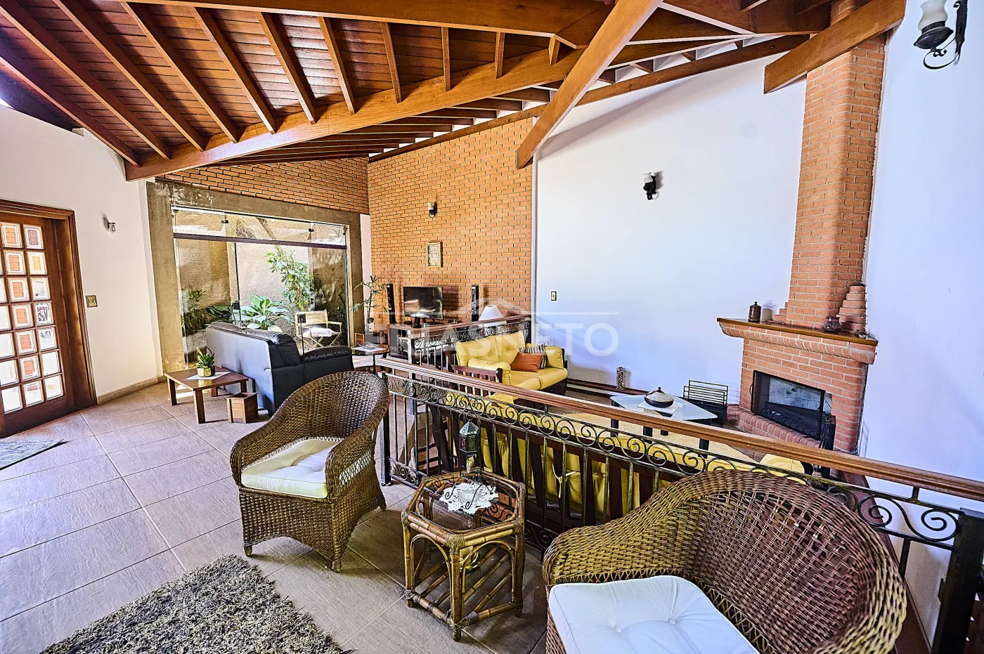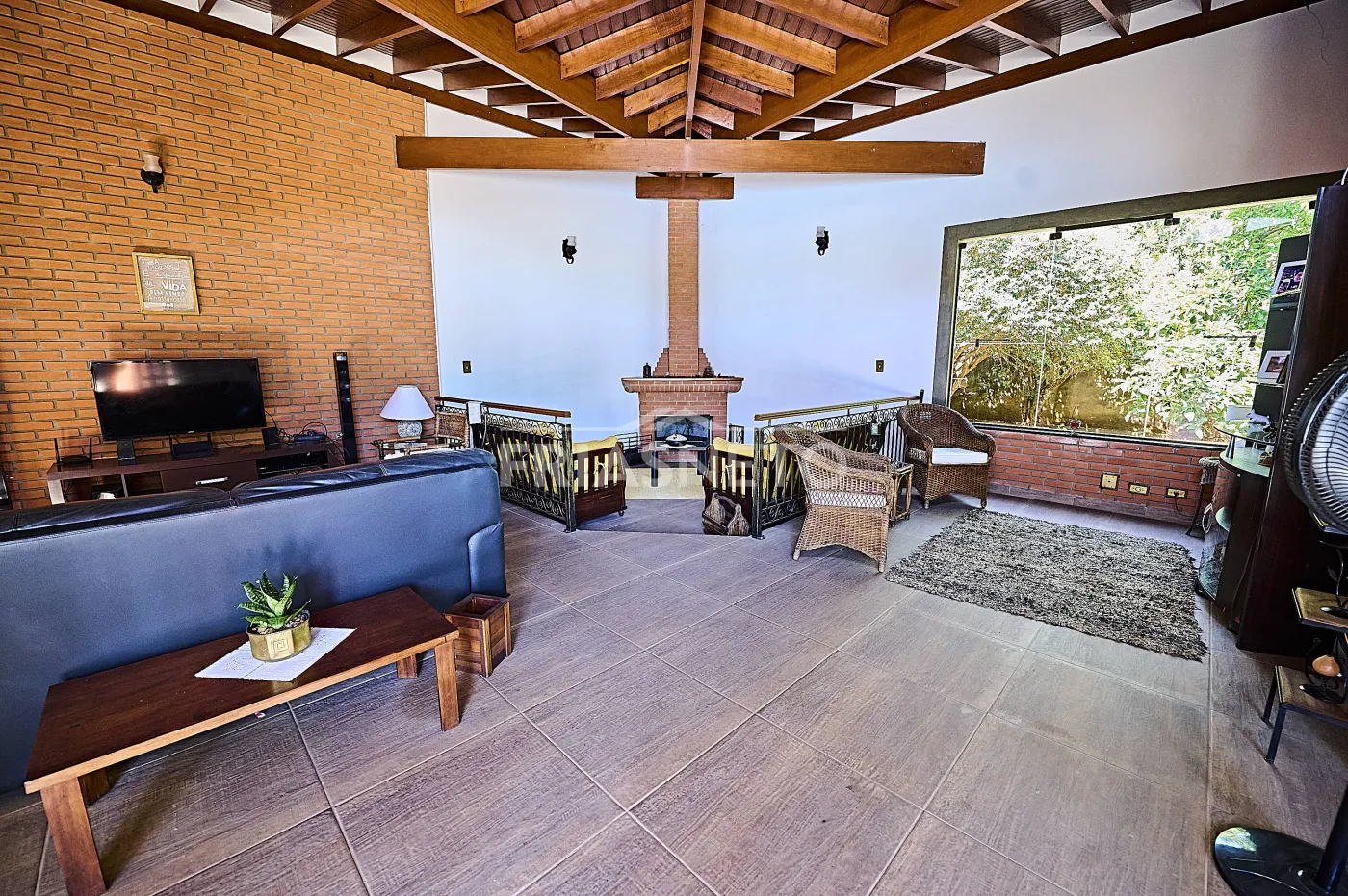 Acomodações para hóspedes contam com 3 dormitórios, sendo 1 suíte ampla e 2 demi-suítes para conforto dos seus convidados e familiares, além de uma sala espaçosa com lareira e pé-direito duplo, integrando charme e elegância;