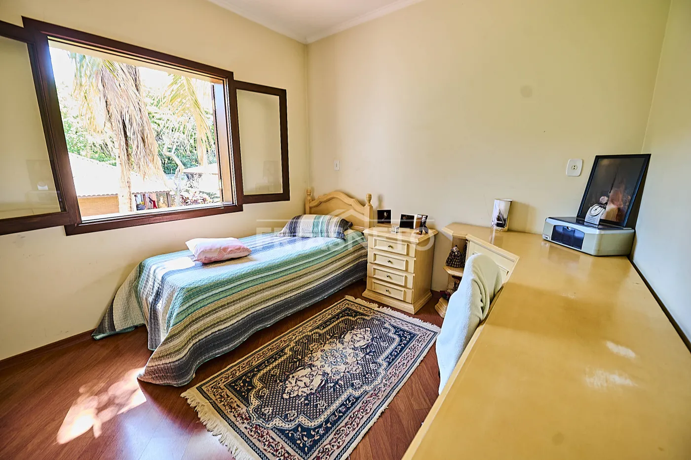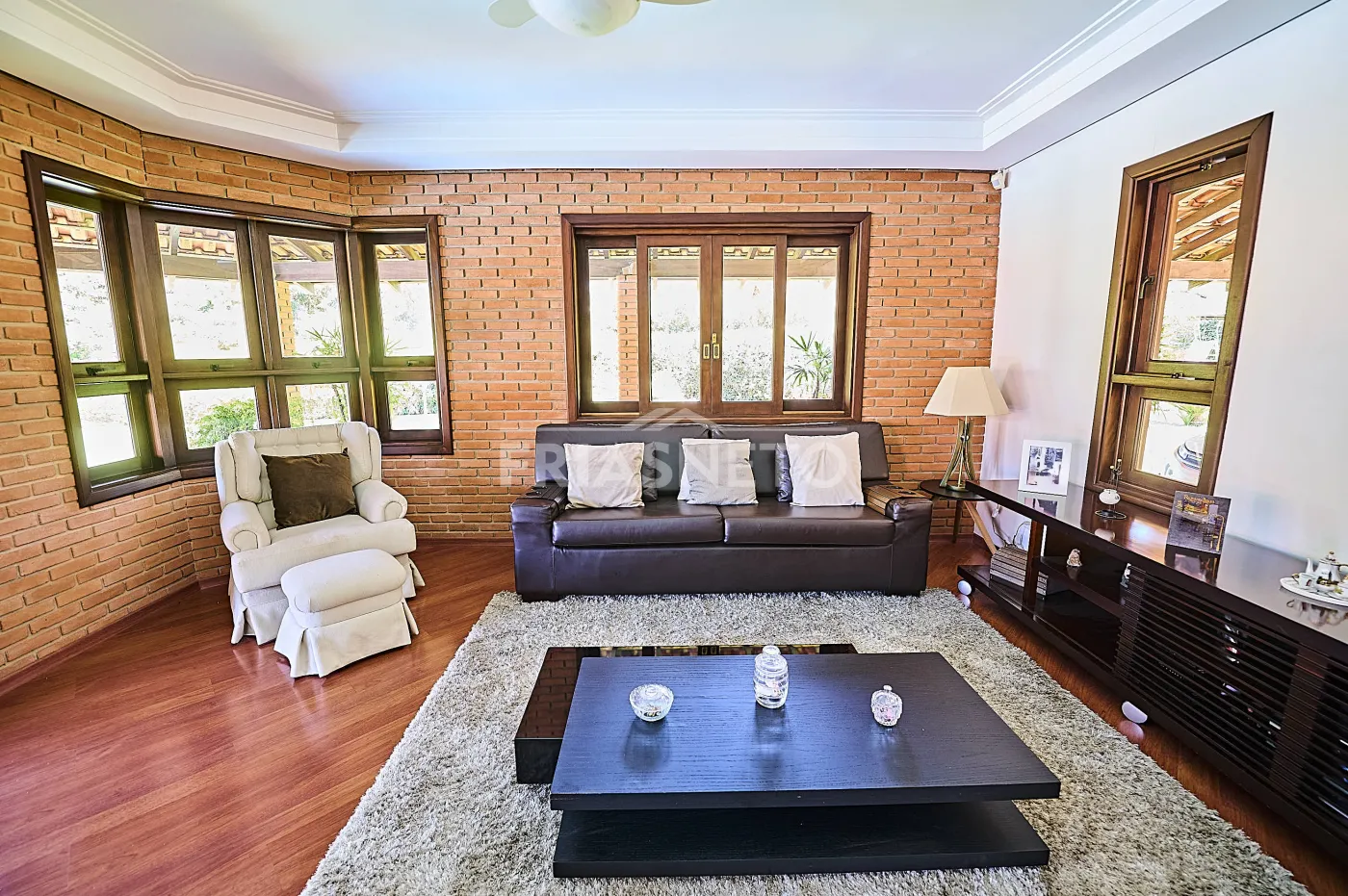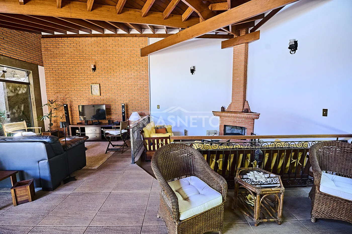 Acomodações para hóspedes contam com 3 dormitórios, sendo 1 suíte ampla e 2 demi-suítes para conforto dos seus convidados e familiares, além de uma sala espaçosa com lareira e pé-direito duplo, integrando charme e elegância;