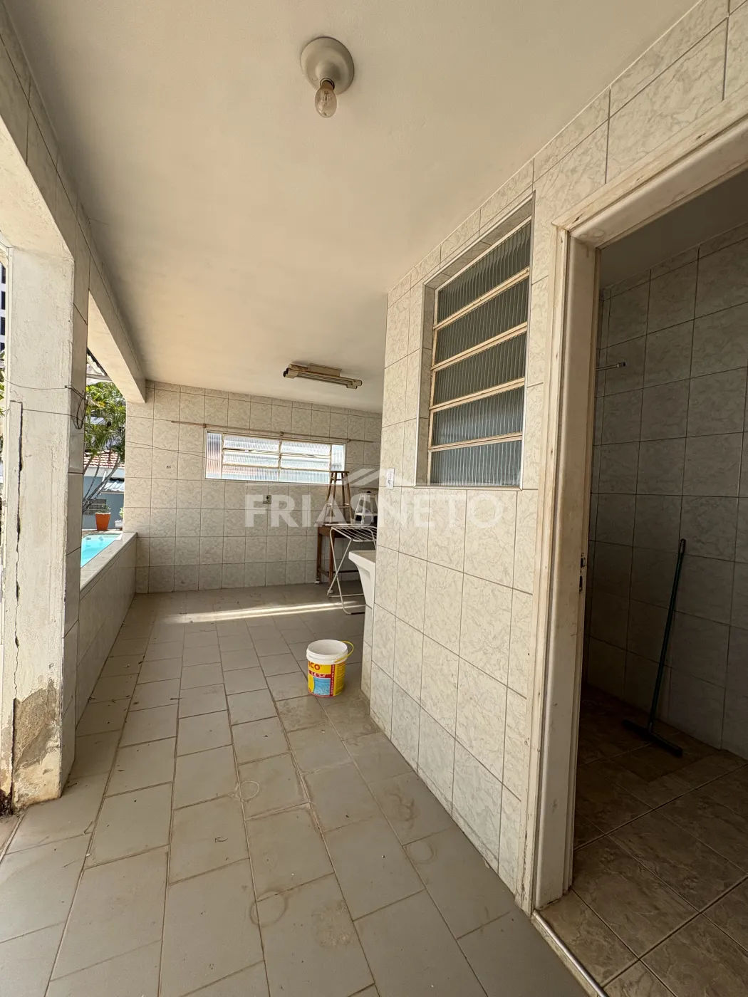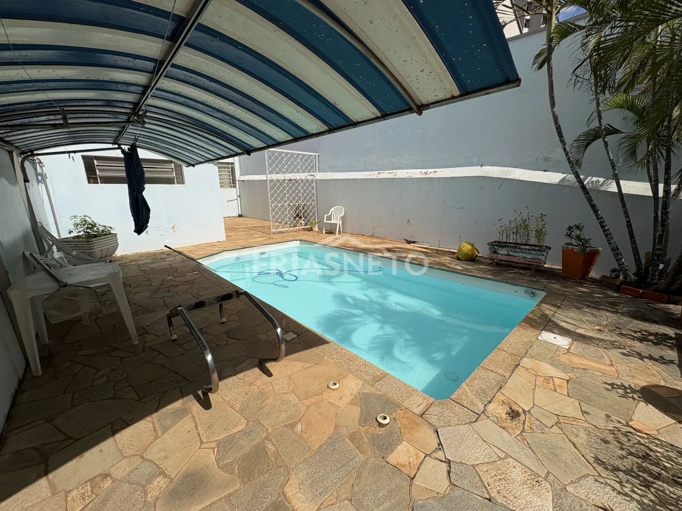 Espaçoso quintal com piscina, área de serviço com banheiro e quarto para despejo.