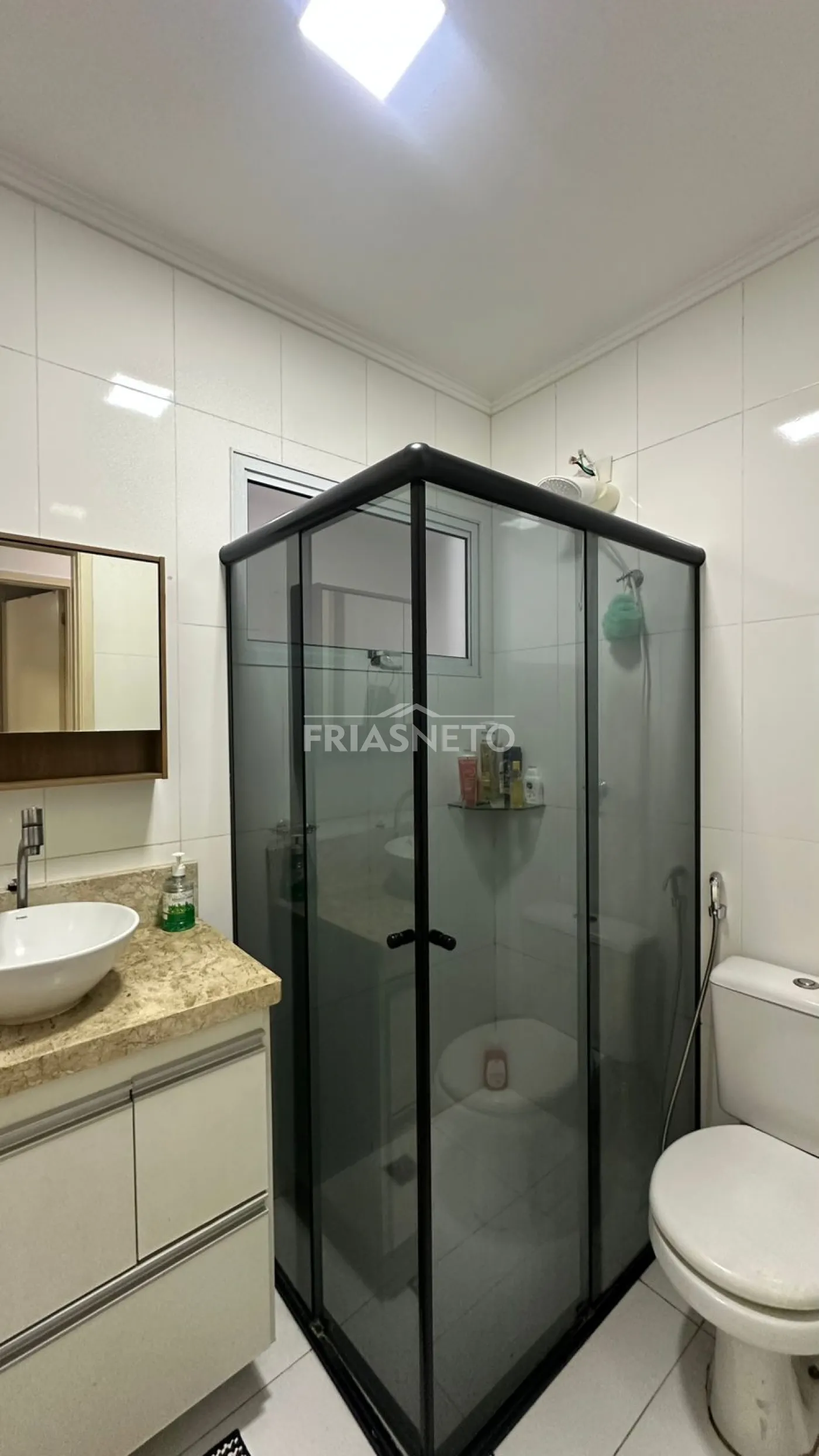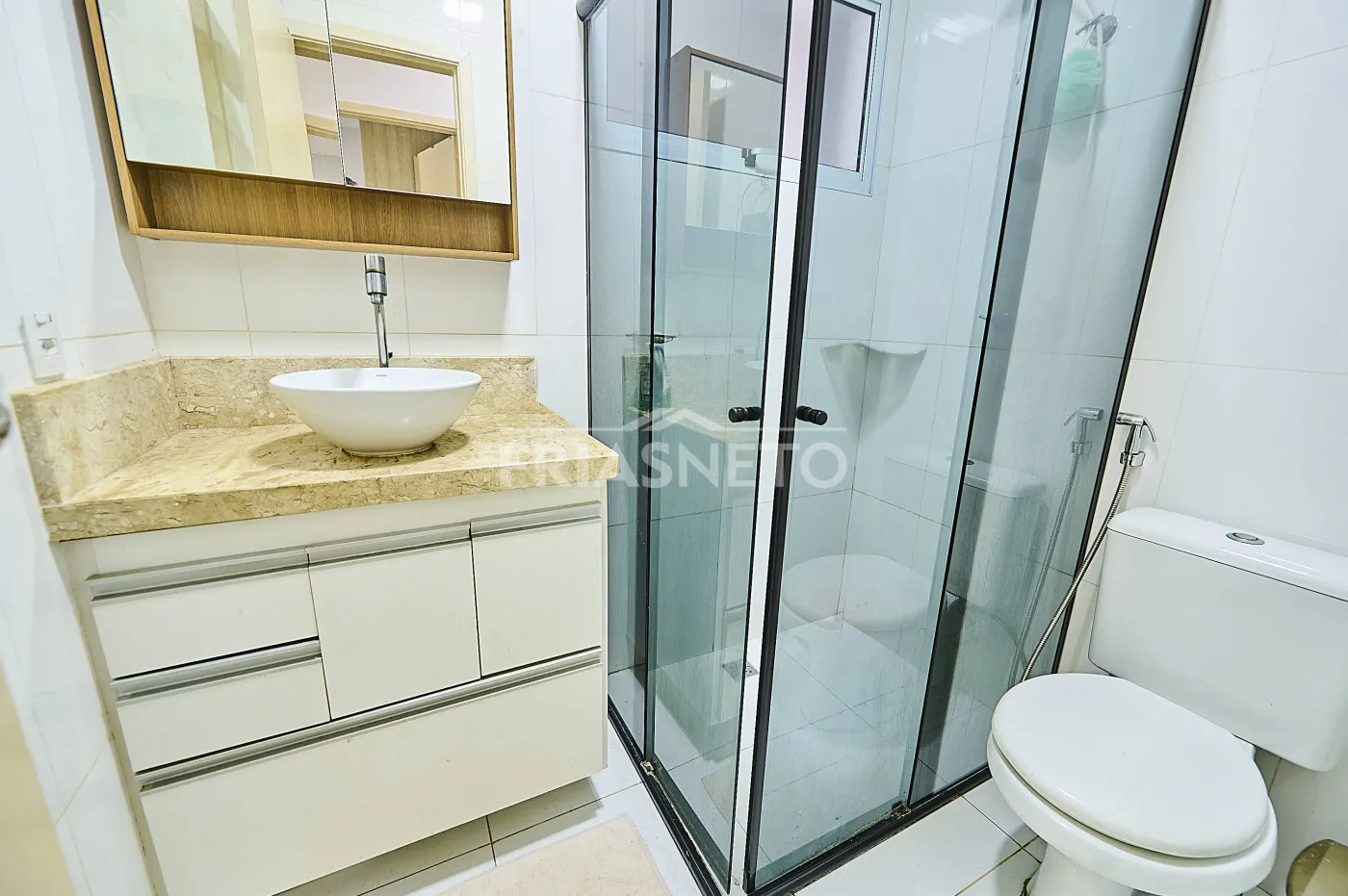 Banheiro social com gabinete e box blindex