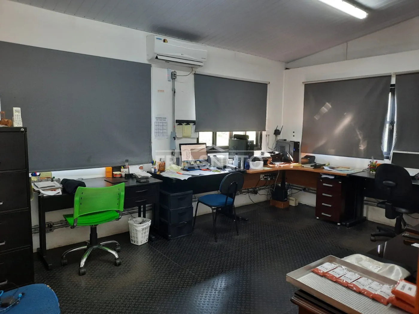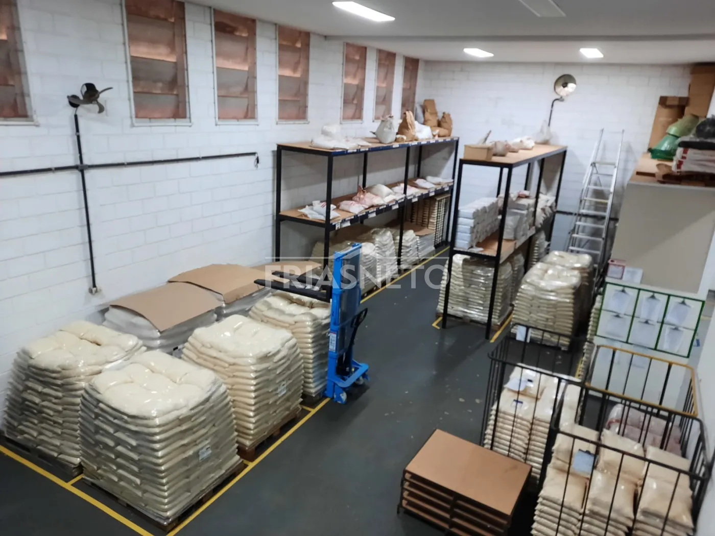 Barracão de 200m², com forro de gesso e luminárias embutidas, divisórias em drywall, cozinha, 2 banheiros e 2 salas para escritório (mezanino em aço).