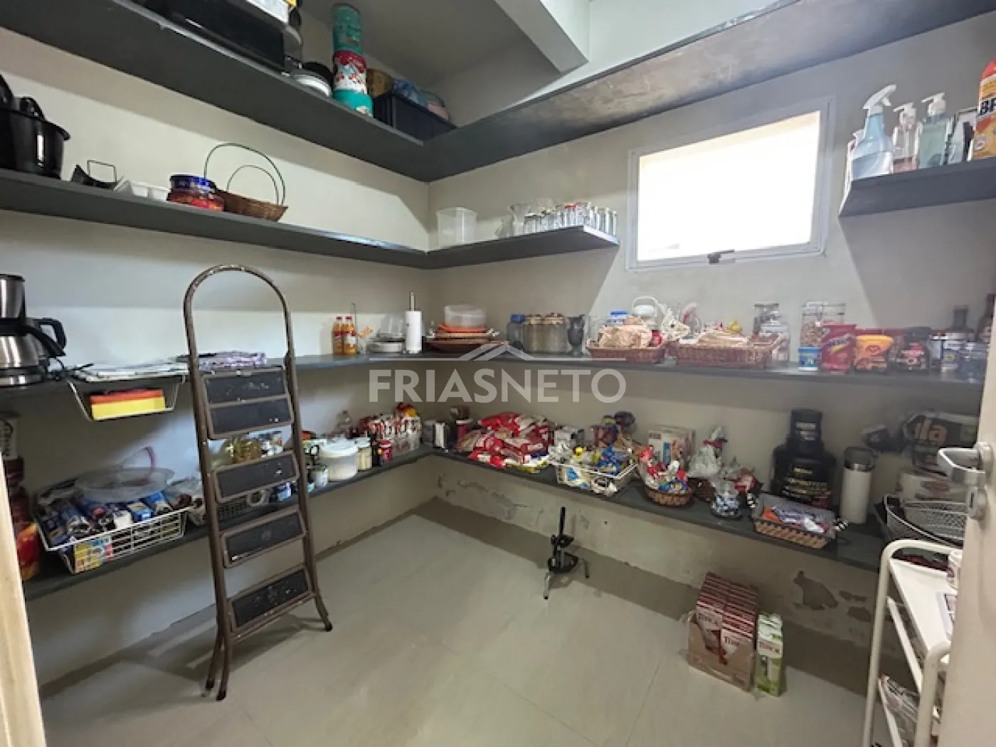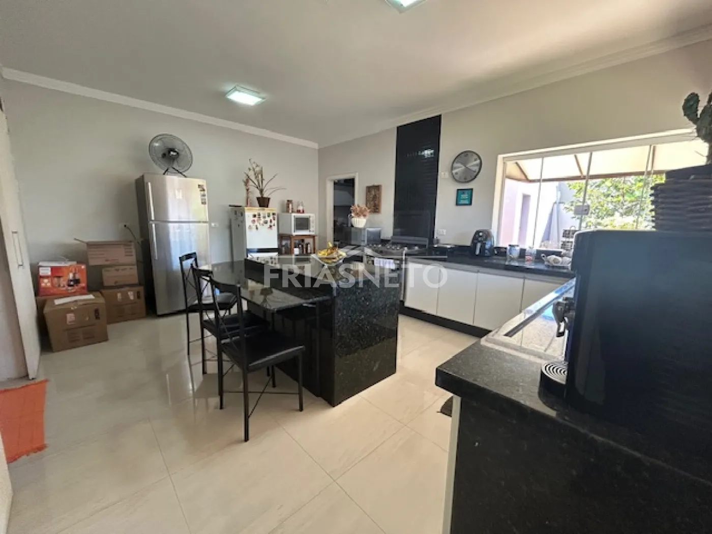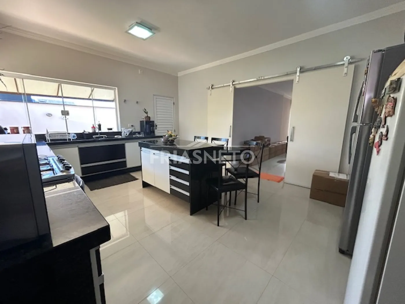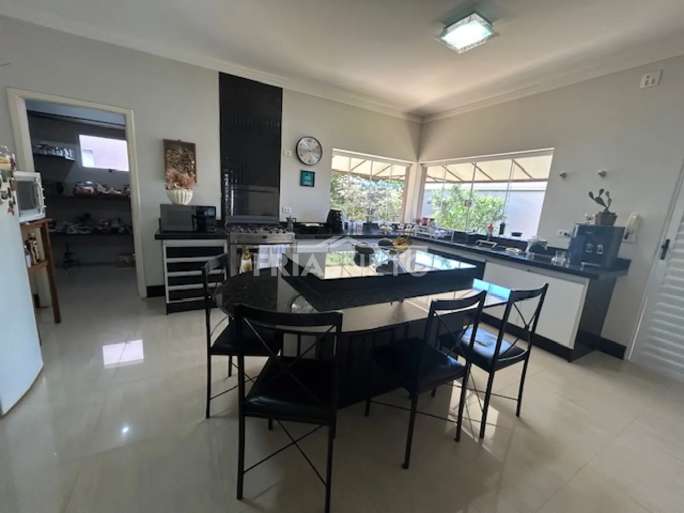 - Ampla cozinha com armários, fogão e dispensa
