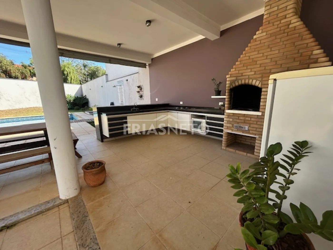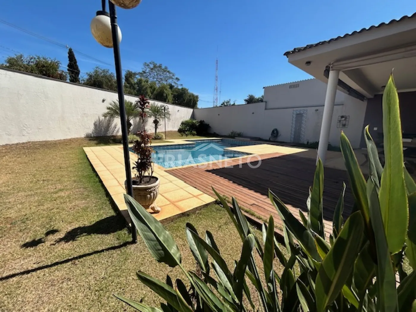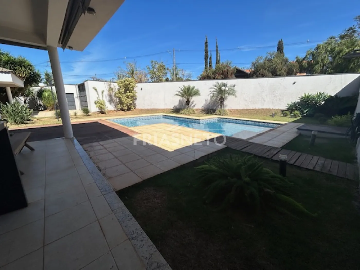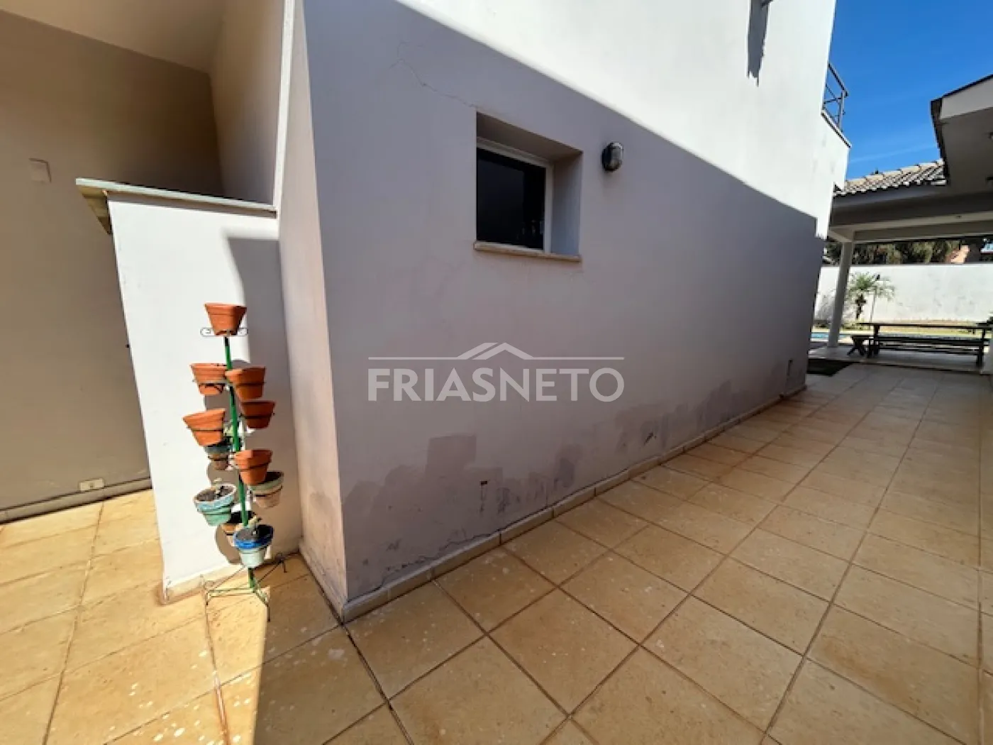 - área externa com porcelanato antiderrapante, cercado por paisagismo, transmitindo aconchego ao imóvel.