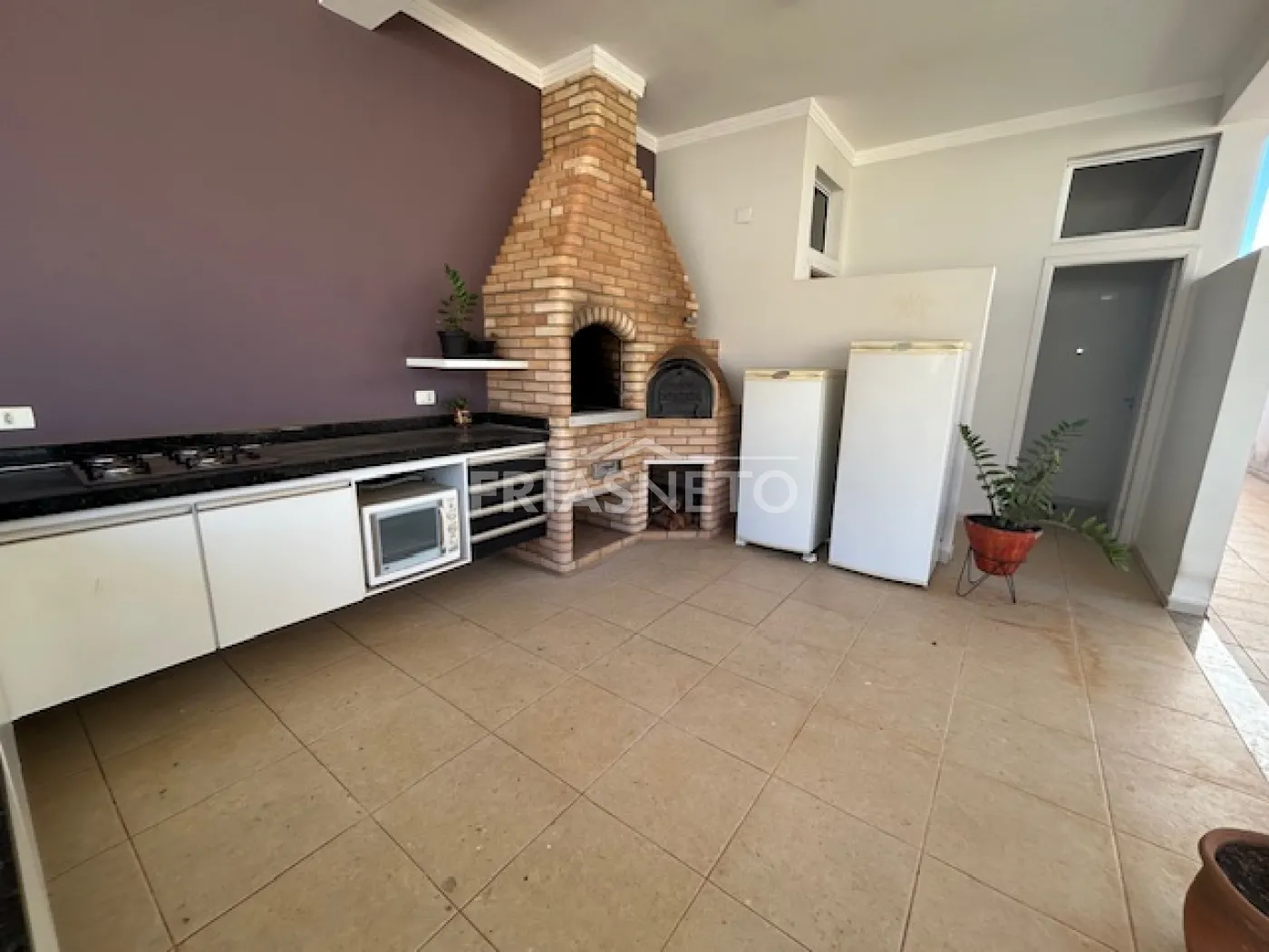 - área gourmet com churrasqueira, cooktop, forno de pizza e forno elétrico